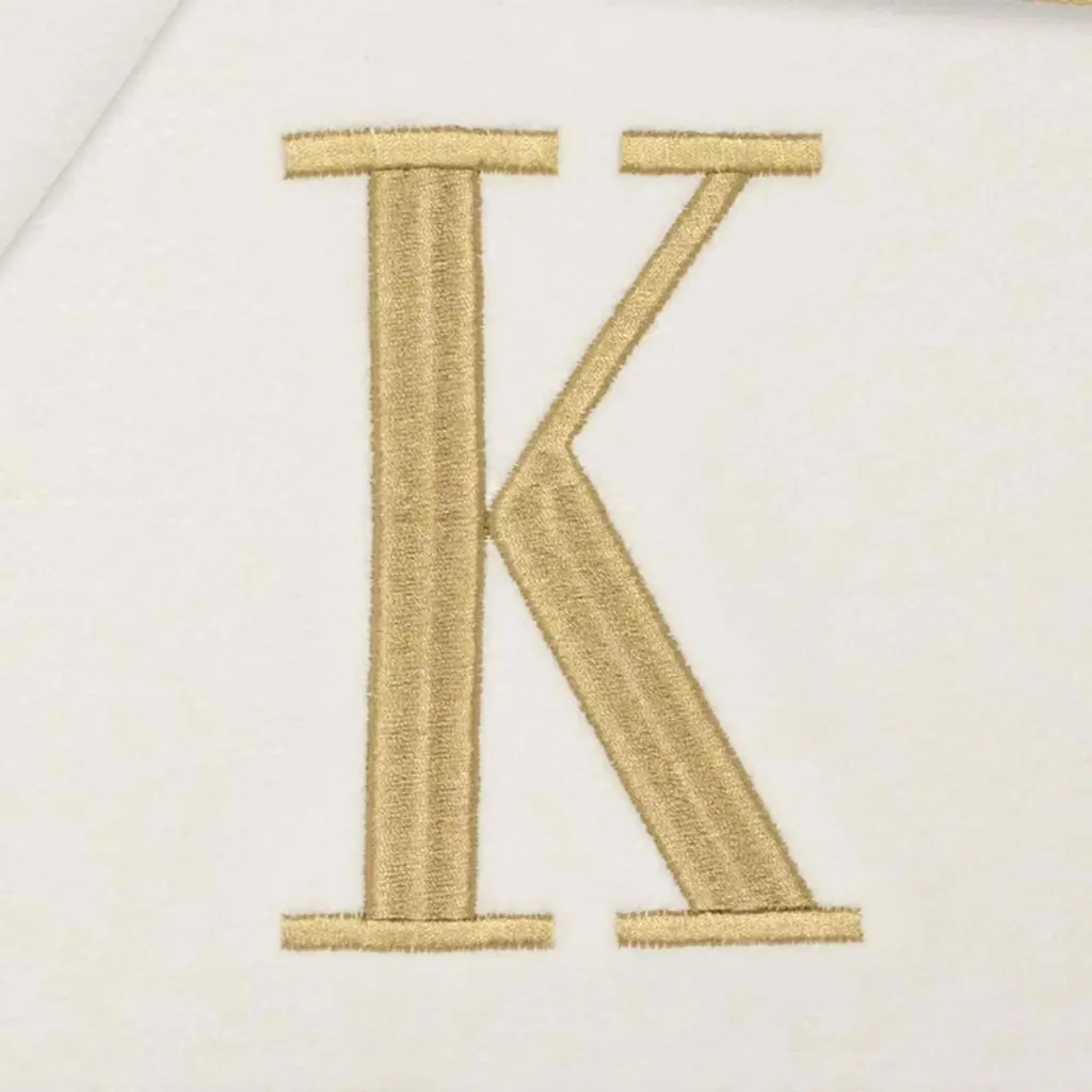 The Avanti "K" 3-Piece Ivory and Gold Monogram Towel Set features an embroidered gold capital block letter "K" on an ivory velour towel with 2 coordinating gold woven polyester stripes. 100% cotton towel set includes one each of bath (27" x 52"), hand (16" x 28") and fingertip (11" x 18".