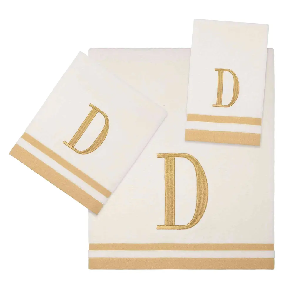 The Avanti "D" 3-Piece Ivory and Gold Monogram Towel Set features an embroidered gold capital block letter "D" on an ivory velour towel with 2 coordinating gold woven polyester stripes. 100% cotton towel set includes one each of bath (27" x 52"), hand (16" x 28") and fingertip (11" x 18".