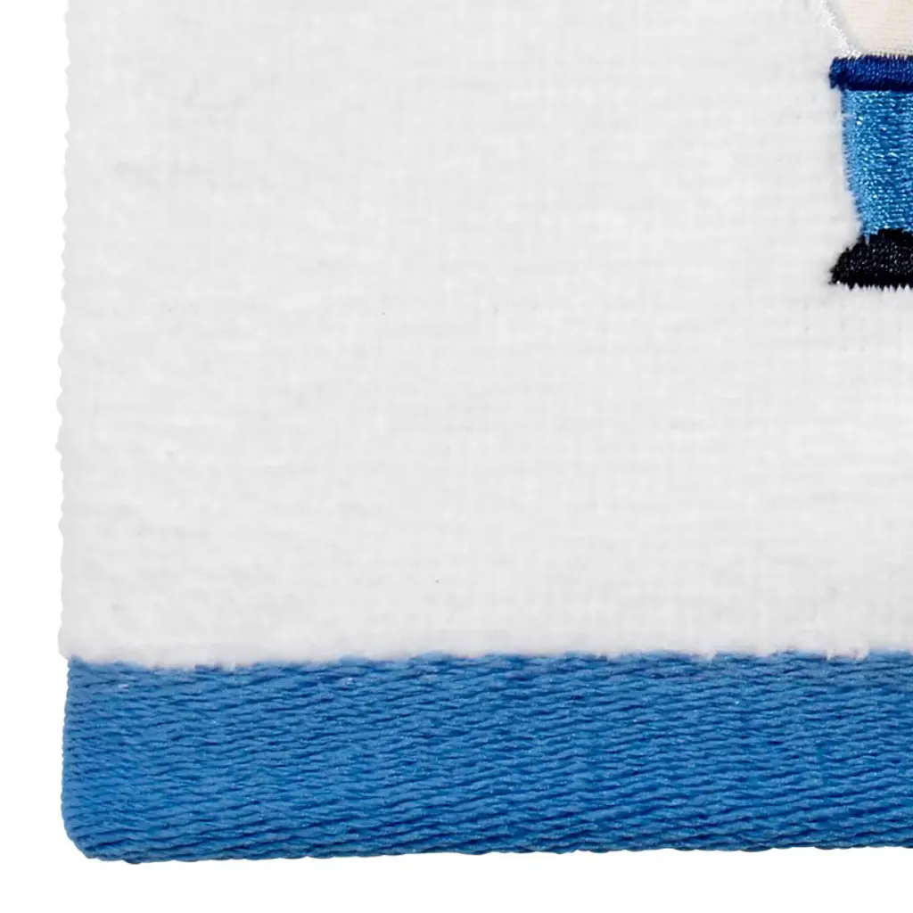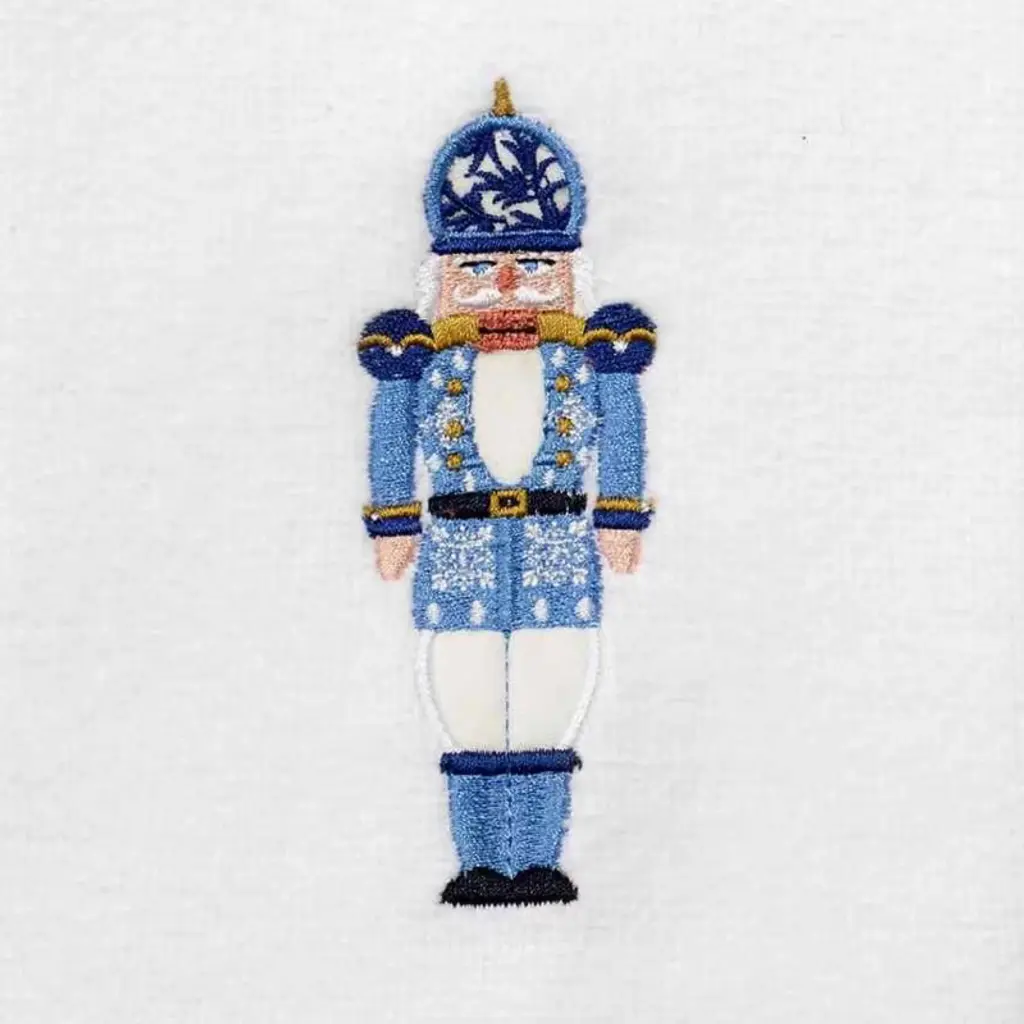 The Avanti Nutcracker Trellis 2-Pack Fingertip Towel Set features an embroidered nutcracker outfitted in various shades of blue. The white 11" x 18" 100% cotton velour towels are finished with a coordinating blue polyester border. Other coordinating pieces available.