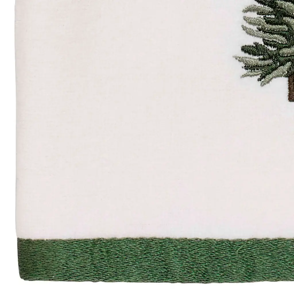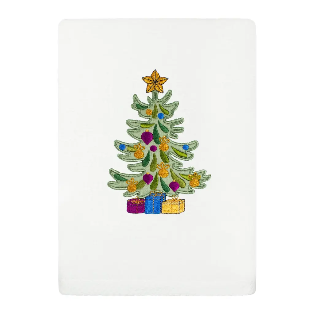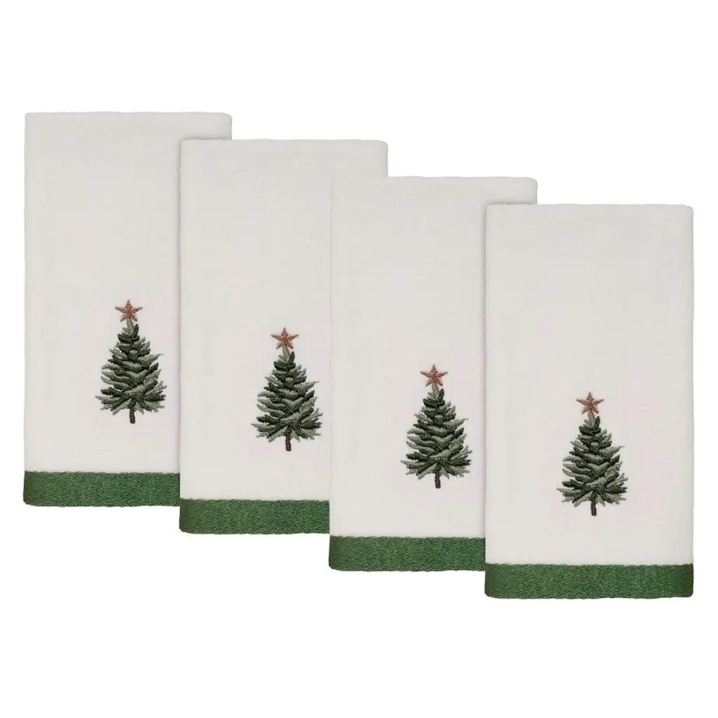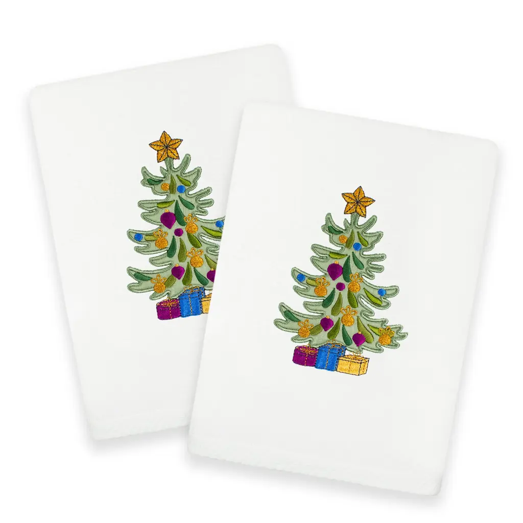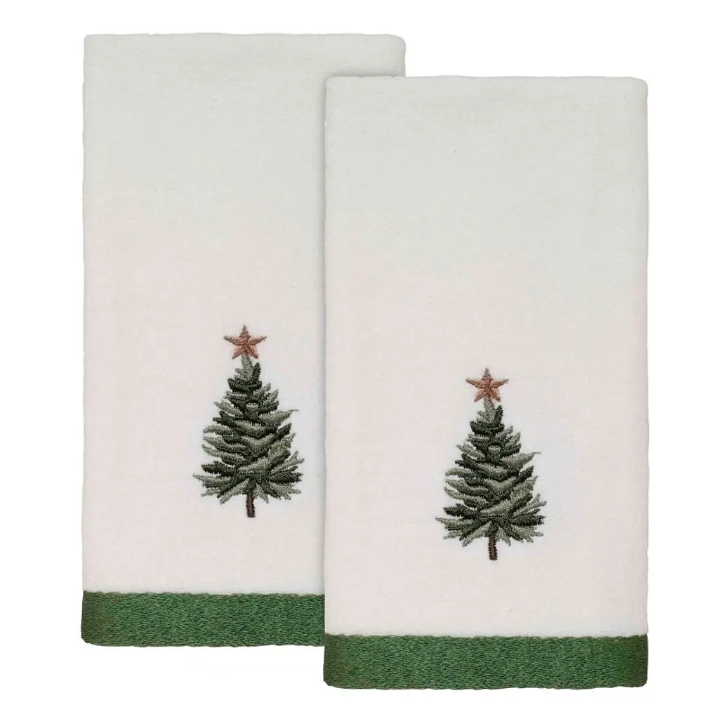 The Avanti Trees Decorative Embroidered Bath Towel 2-Pack features 3 embroidered pine trees in shades of green with gold stars on top. The 27" x 50" white velour 100% cotton towels (exclusive of embellishement) are finished with a coordinating green border.