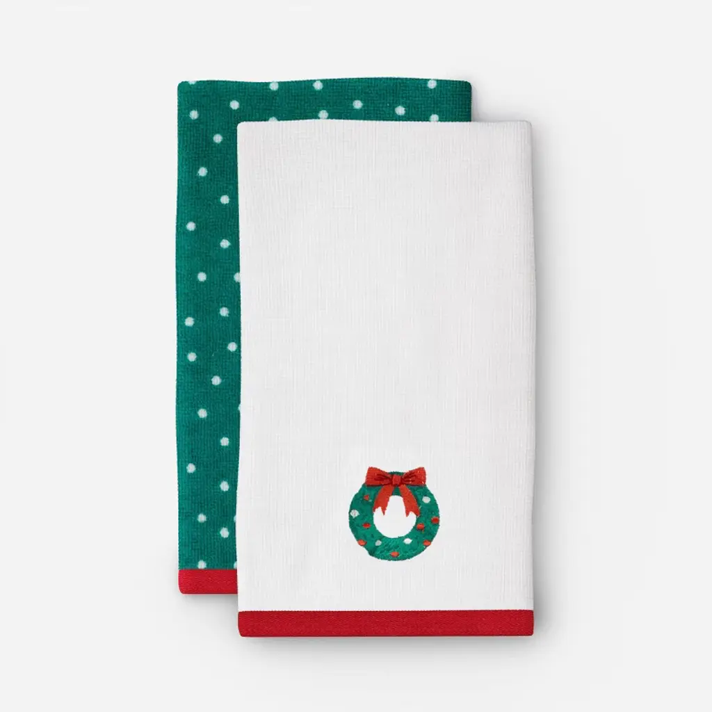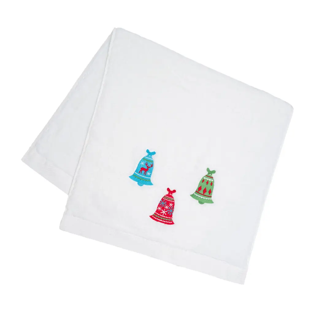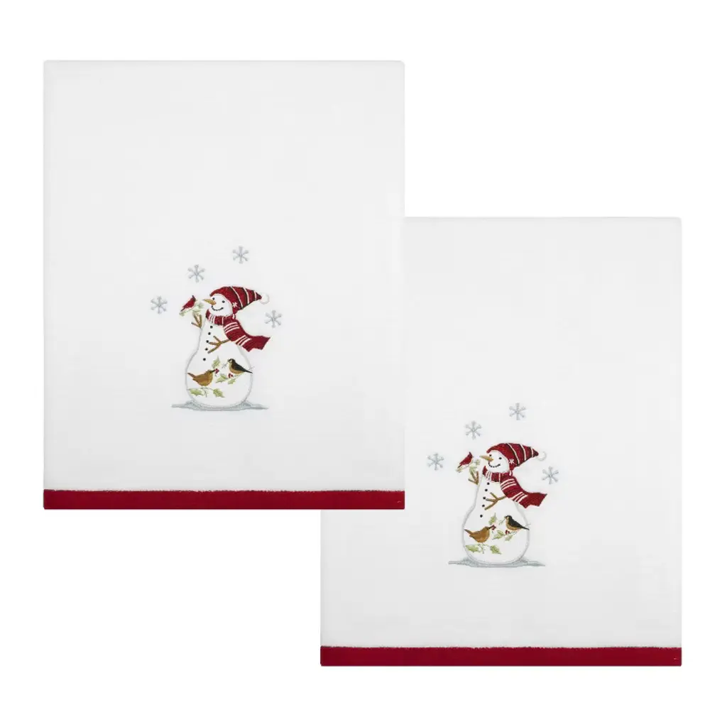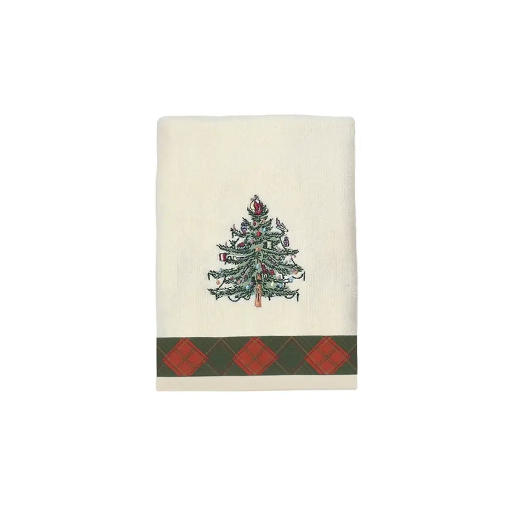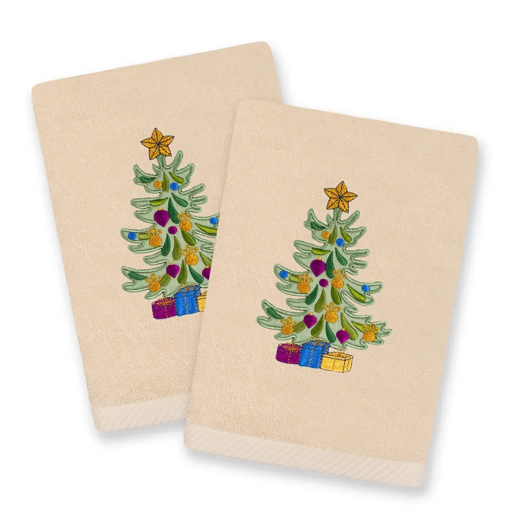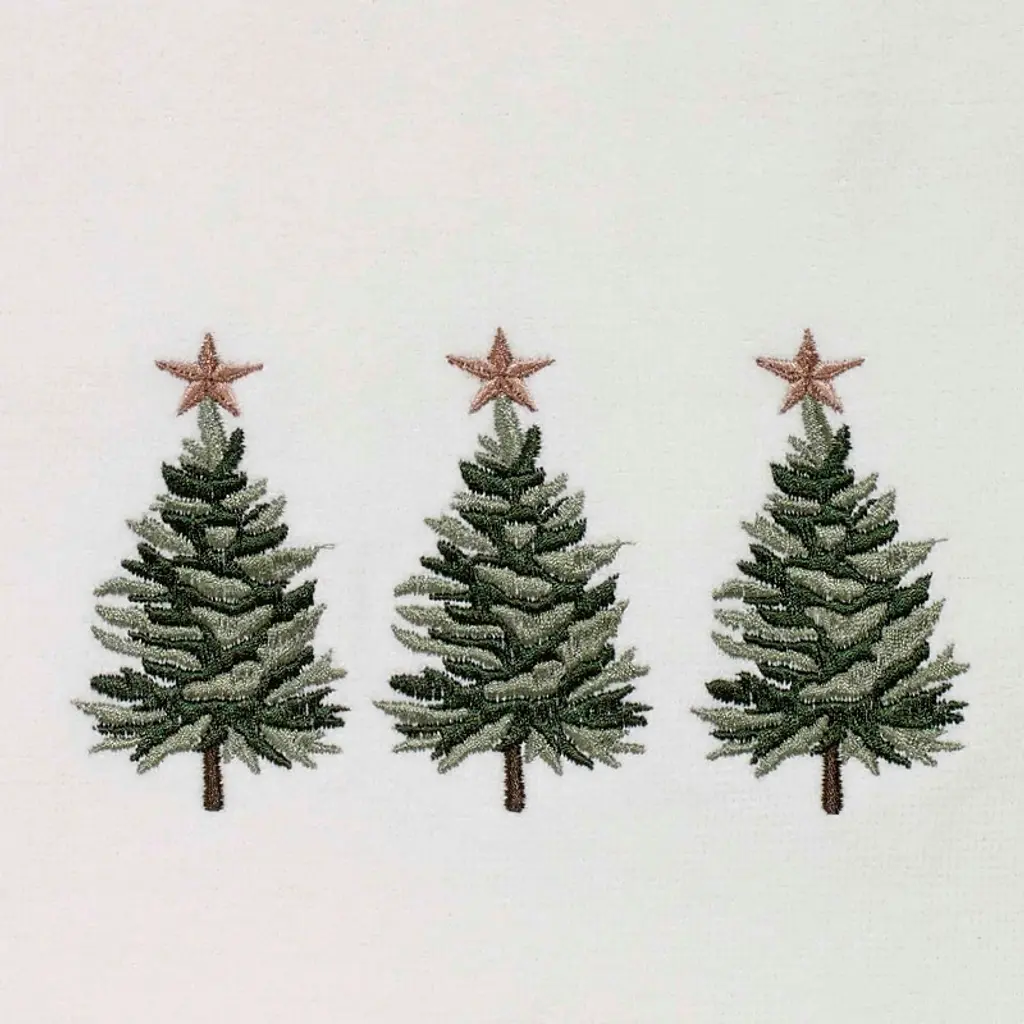 The Avanti Trees Decorative Embroidered Bath Towel 2-Pack features 3 embroidered pine trees in shades of green with gold stars on top. The 27" x 50" white velour 100% cotton towels (exclusive of embellishement) are finished with a coordinating green border.