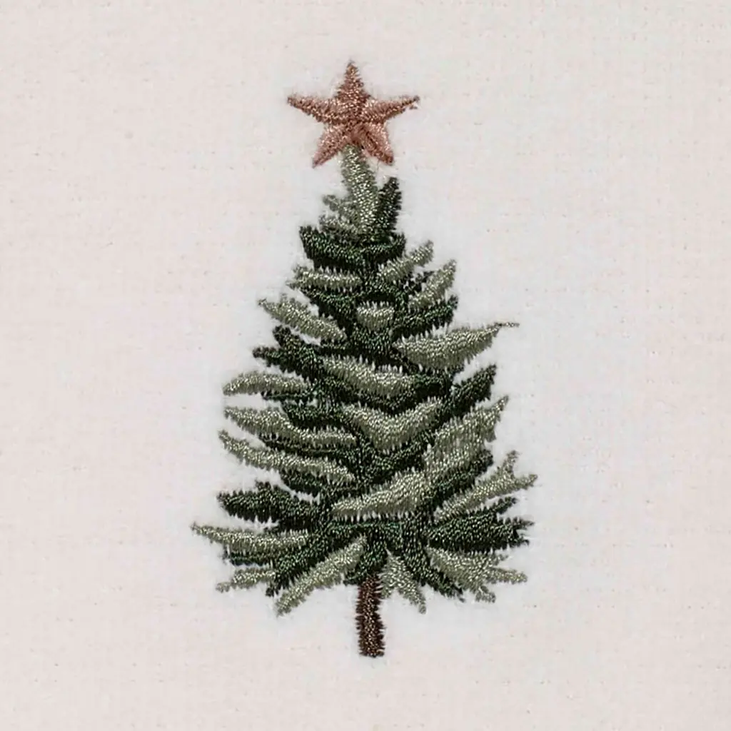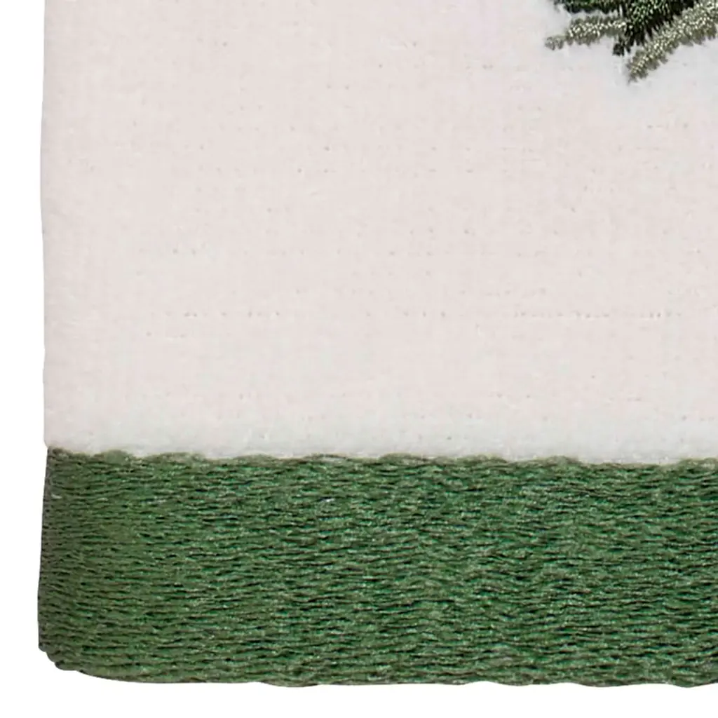 The Avanti Trees Decorative Embroidered Fingertip Towel 4-Pack features an embroidered pine tree in shades of green with a gold star on top. The 11" x 18" white velour 100% cotton towels (exclusive of embellishement) are finished with a coordinating green border.
