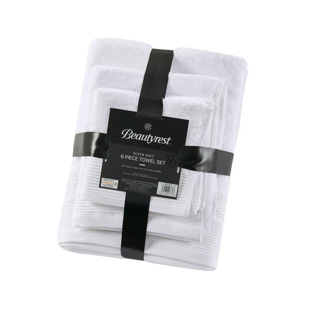 The Beautyrest Nuage 6PC Towel Set features premium quality with a natural sheen, plush touch and high absorbency, finished with a ribbed cuffed hem. It offers an eco-friendly option, while a silver infusion provides antimicrobial and odor control.Features:Dimensions: