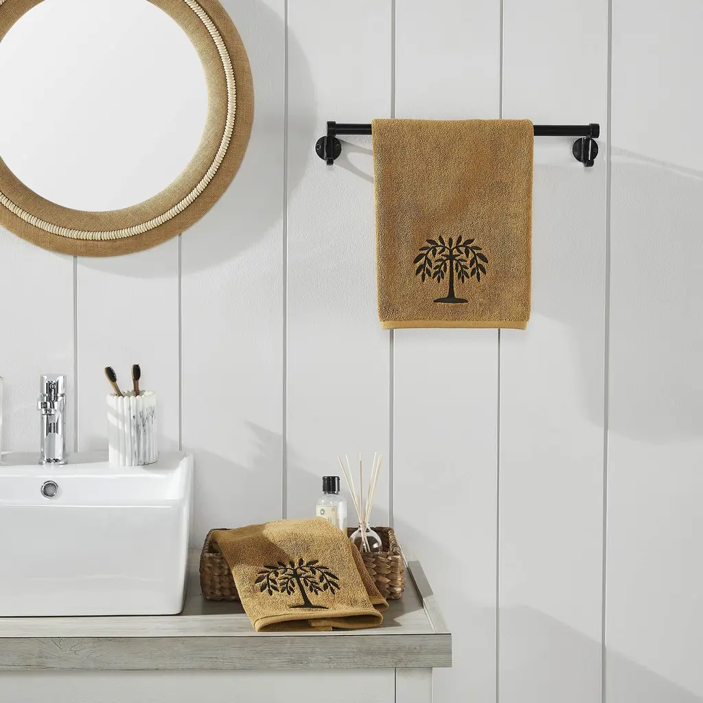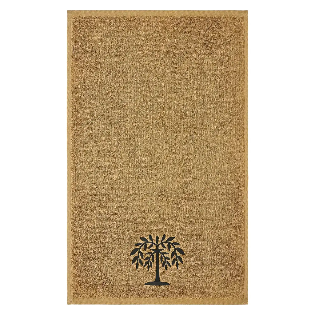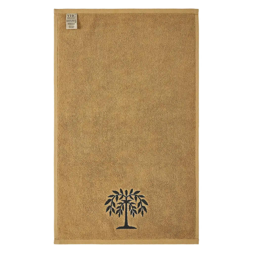Enhance your bathroom's rustic charm with the VHC Brands Black Willow Tree Tan Hand Towel Set of 2. Made from soft and absorbent cotton terrycloth, these towels are designed for both functionality and style. The neutral doe tan color provides a warm, natural base, while the embroidered black willow tree at the bottom adds a touch of primitive elegance, making these towels a perfect fit for a rustic or country-inspired bathroom. Each towel measures 16x26 inches, offering a practical size for daily use, whether displayed by the sink or hung on a towel bar. The intricate embroidered willow tree design in rustic black brings a timeless and serene feel to your washroom, complementing the simplicity of the solid color background. These towels are machine washable, making them easy to care for while maintaining their quality and softness. The VHC Brands Black Willow Tree Tan Hand Towel Set combines everyday practicality with a classic primitive design. Ideal for adding a cozy, country touch to your bathroom, these decorative towels serve as both functional accessories and stylish decor, making them a perfect addition to any homestead or rustic washroom.