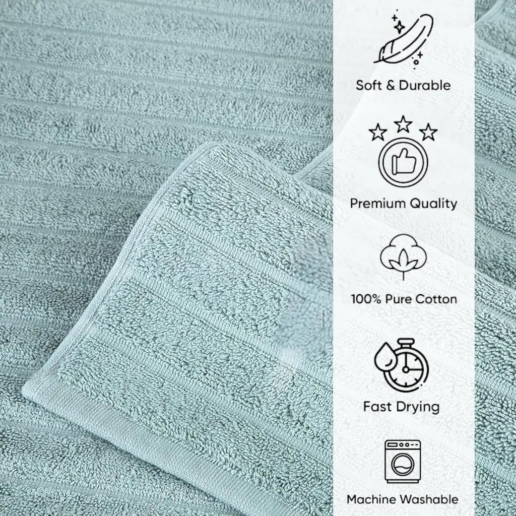 Our premium 6-piece towel set is crafted from 100% pure cotton, providing superior absorbency and a luxuriously soft feel. With a 600 GSM thickness, these towels are built to last, featuring durable stitching and beautifully finished edges. They're easy to care for, being machine-washable and quick-drying. For best results, wash in warm or cold water before the first use, avoiding bleach and fabric softeners. These towels are versatile enough for various uses, whether drying hands, wiping your face, or adding a chic touch to your bathroom decor. Perfect for home, gym, or travel, this set includes two bath towels (27 x 54 inches), two hand towels (20 x 32 inches), and two washcloths (13 x 13 inches).