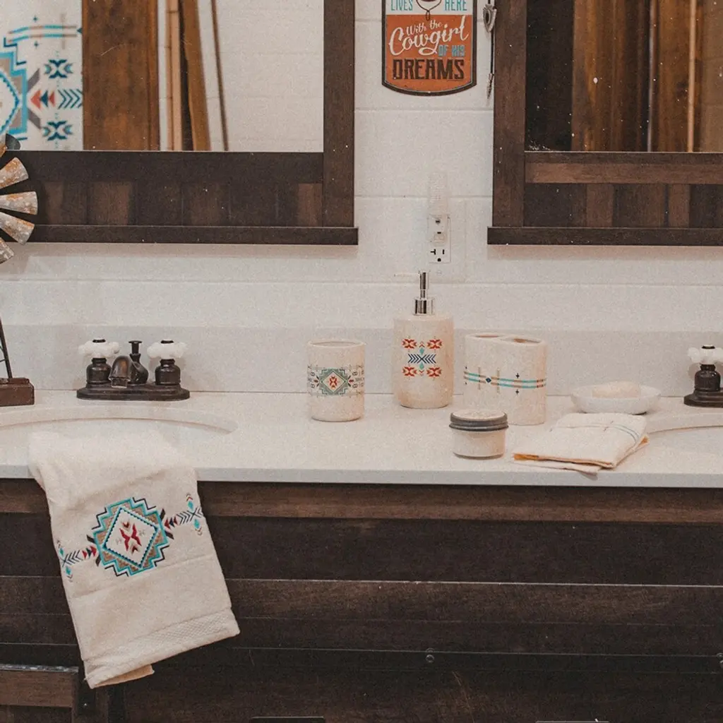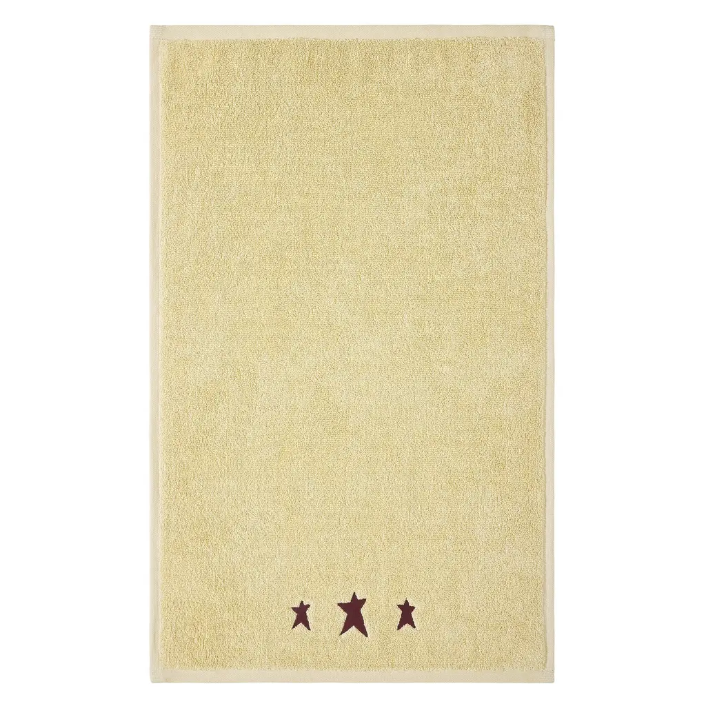 Add a rustic touch to your bathroom with the VHC Brands Burgundy Prim Stars Creme Hand Towel Set of 2. Made from plush and absorbent cotton terrycloth, these towels offer both softness and practicality. The gentle soybean creme hue provides a soothing, neutral backdrop, while the rich burgundy embroidered stars at the bottom bring a striking, primitive charm to your bathroom decor. Each towel measures 16x26 inches, making them perfect for use by the sink or on a towel rack. The three embroidered primitive stars add a touch of rustic elegance, ideal for enhancing primitive or country-style washrooms. These towels are also machine washable, ensuring they are easy to care for while maintaining their softness and quality. Designed to blend practicality with a timeless rustic appeal, the VHC Brands Burgundy Prim Stars Creme Hand Towel Set is a beautiful and functional addition to your bathroom. Perfect for creating a cozy, primitive atmosphere, these towels combine everyday utility with decorative charm, making them a delightful accent for any home.