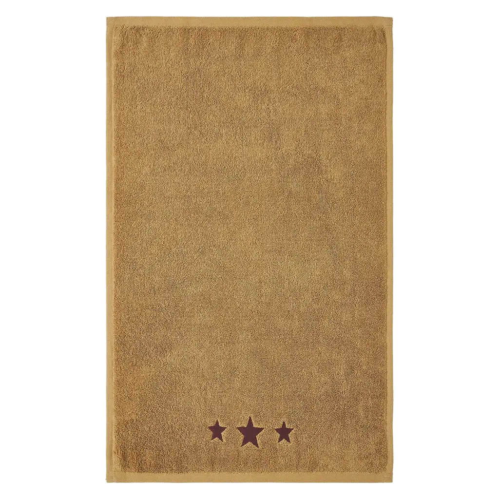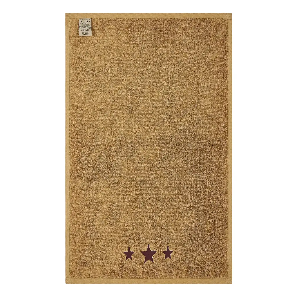Add a warm, rustic touch to your bathroom with the VHC Brands Burgundy Stars Tan Hand Towel Set of 2. Crafted from plush and absorbent cotton terrycloth, these hand towels offer both softness and practicality. The neutral doe tan color serves as a versatile backdrop, while the rich burgundy embroidered stars at the bottom provide a striking contrast that enhances farmhouse and country-style decor. Each towel measures 16x26 inches, making them the perfect size for hanging by the sink or on a towel bar. The embroidered design of three five-point prairie barn stars brings a classic touch of rustic charm, ideal for creating a cozy and inviting atmosphere in your bathroom. Machine washable for easy care, these towels are as functional as they are decorative. Whether you're looking to elevate the look of your bathroom or add a farmhouse accent, the VHC Brands Burgundy Stars Tan Hand Towel Set delivers both style and practicality. These beautifully designed towels offer a perfect blend of everyday utility and timeless country flair, making them a delightful addition to your home.