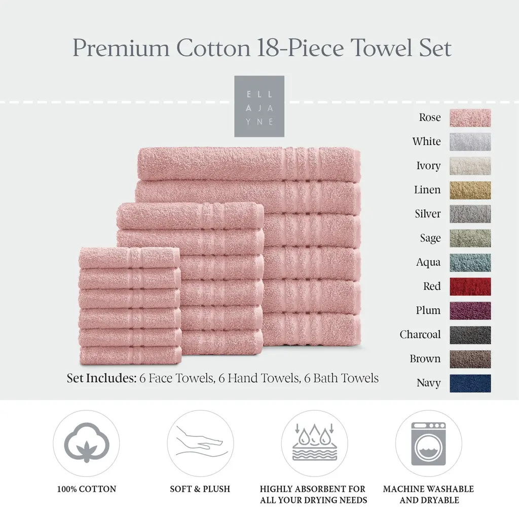 Cotton 18-Piece Face-Hand-Body Towel Set - Face, Hand & Bath - Rose