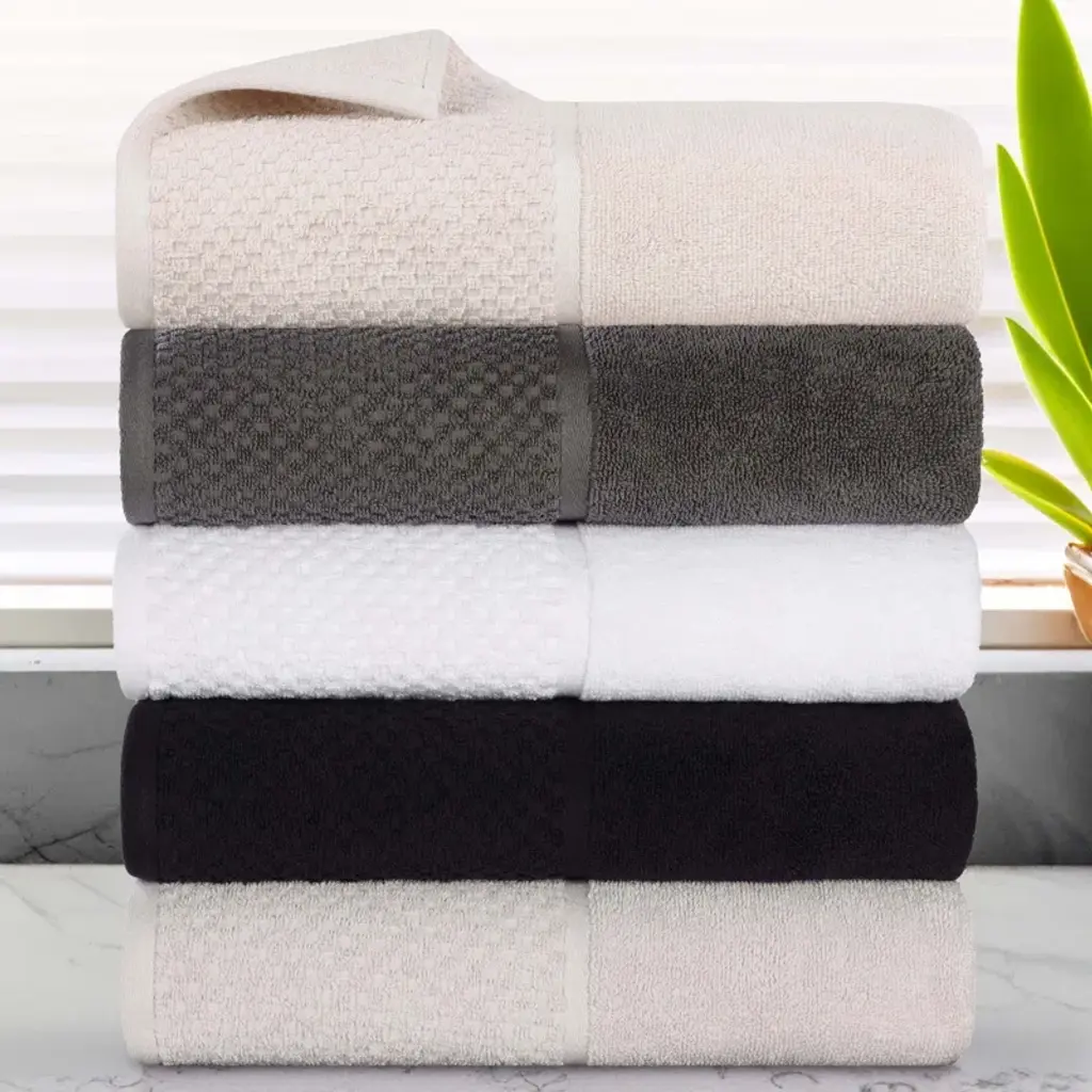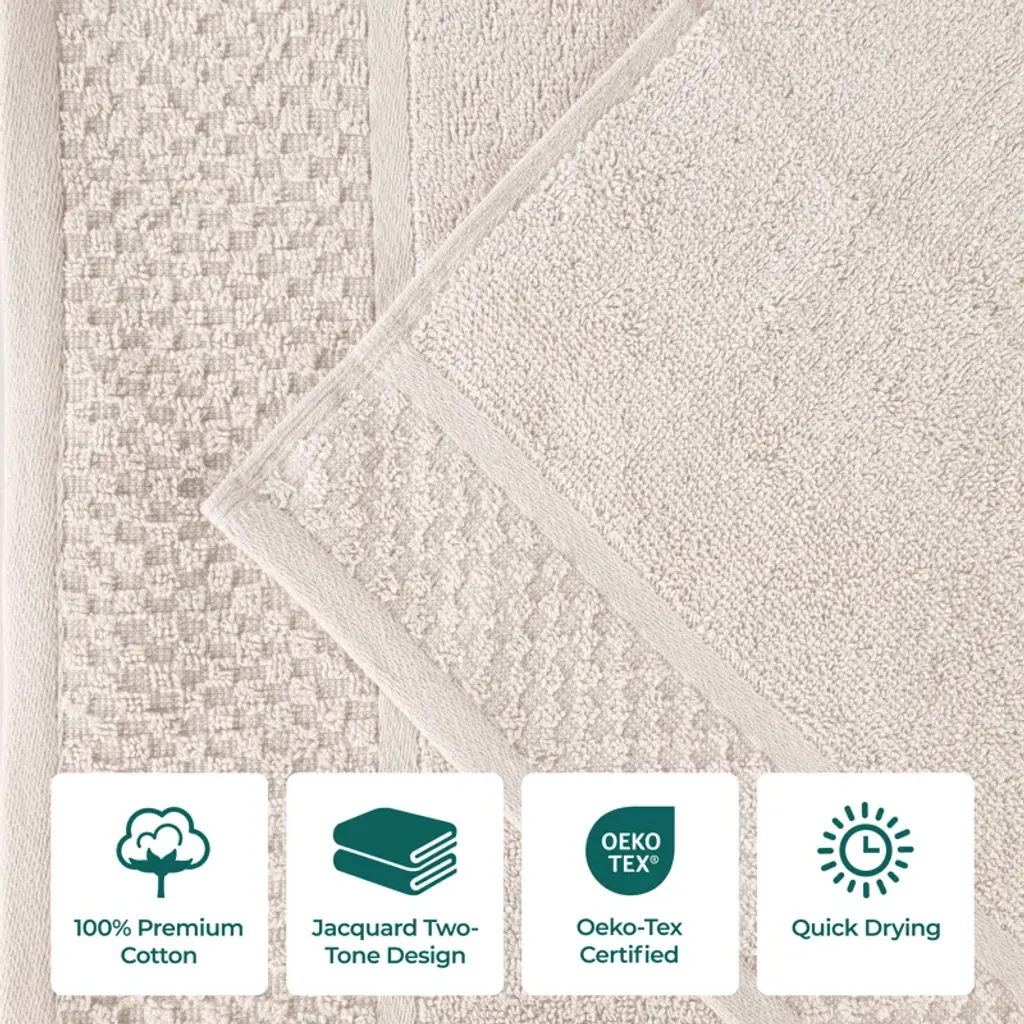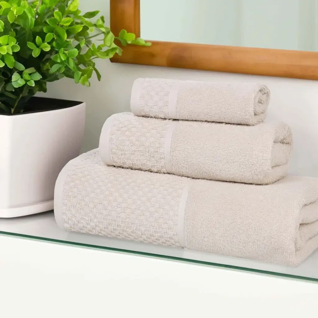 Invigorating and stylish, our Cotton Jacquard Solid 3 Piece Towel Set is a must-have addition to your powder room. Our fluffy cotton towels have a luxuriously soft feel and are highly-absorbent to get you dry quickly. The medium weight thickness of each towel is versatile and perfect as spa towels, bath decor, pool towels, or for personal hygiene. Each piece in this beautiful bathroom set features a solid design and textured jacquard finish with an attached hanging loop for effortless drying. These towels are available in Stone, Ivory, White, Black, and Charcoal color options to match your bathroom decor style. This assorted towel set includes; 1 face towel, 1 hand towel, and 1 bath towel.