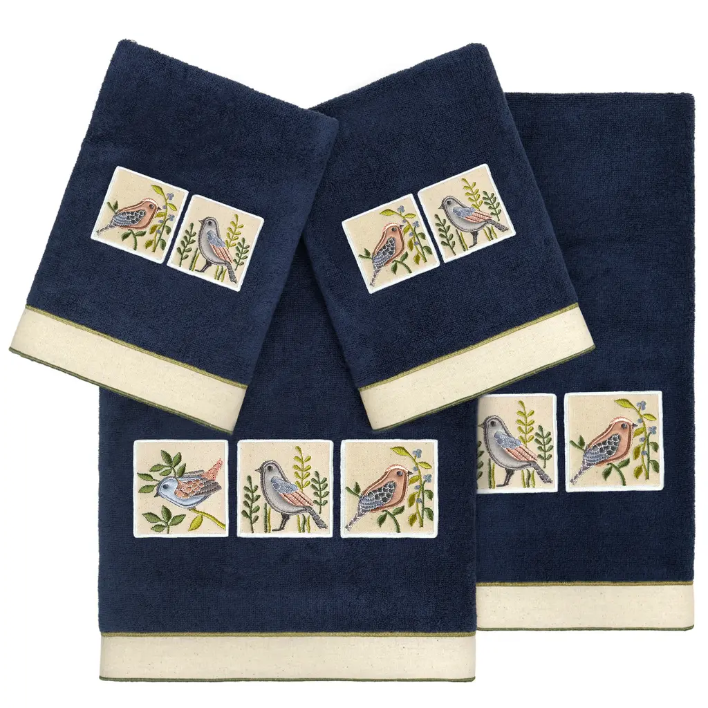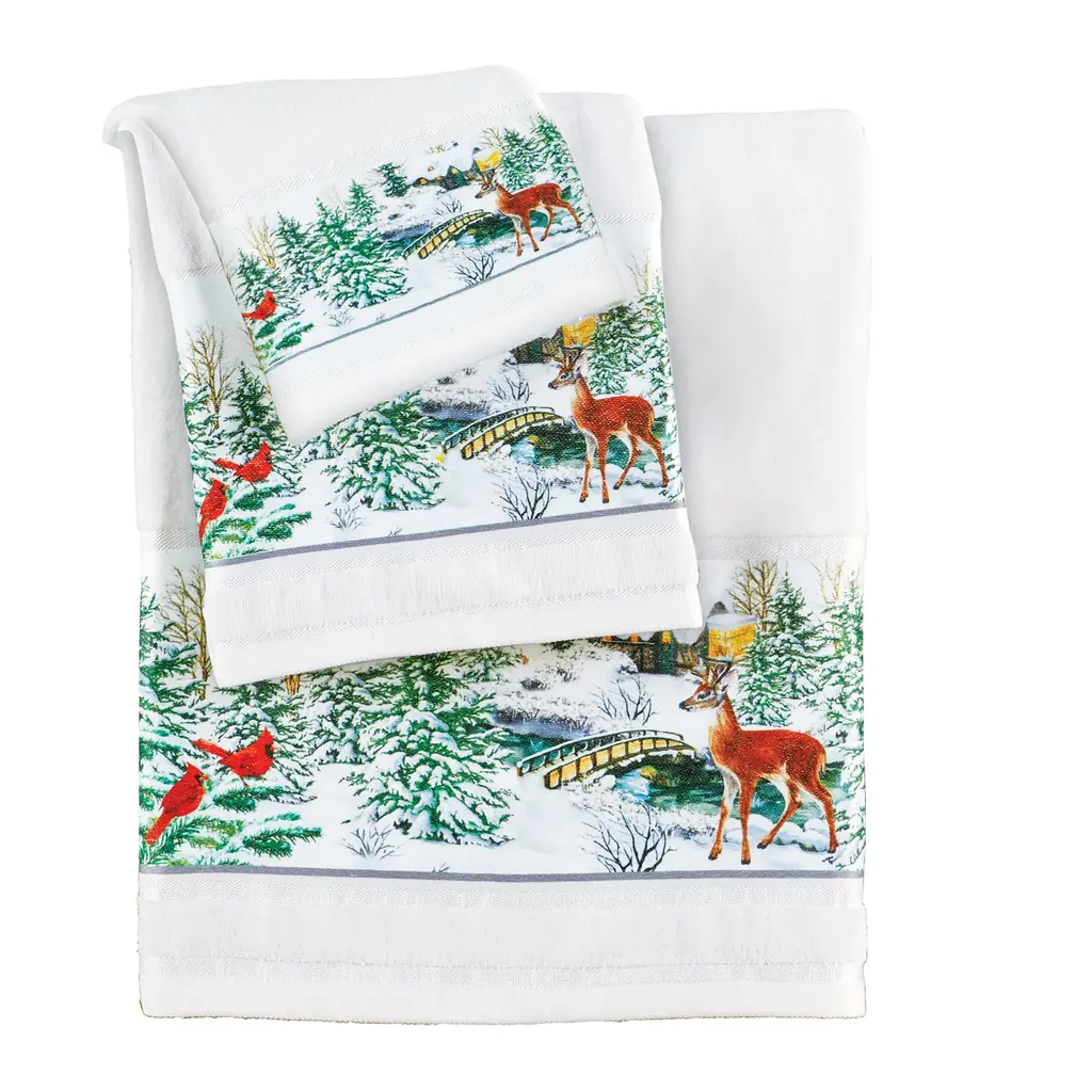 This 3-piece towel set features a snowy cabin in the woods with woodland animals in the foreground. The set includes a 48"L x 24"W bath towel, 25"L x 16"W hand towel, and a 12"Sq. washcloth. Machine wash. Cotton and polyester; imported.