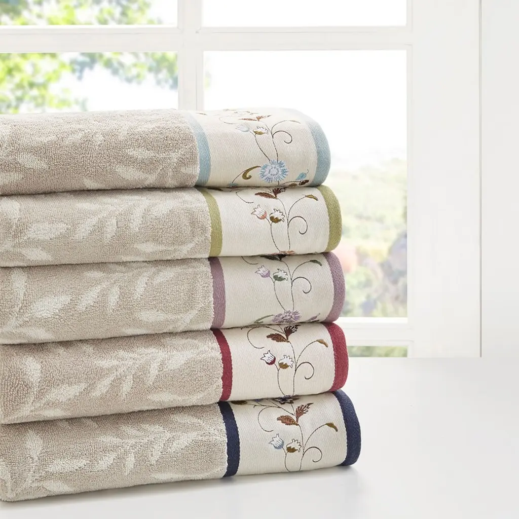 Enhance your bathroom décor with our exquisite 6-Piece Floral Embroidered Cotton Jacquard Towel Set. These cotton towels feature a luxurious jacquard leaf pattern accentuated by a floral embroidered hem and contrast piping, creating a beautiful and sophisticated aesthetic.Not only do these towels prioritize style, but they also maximize your comfort and well-being. They are Oeko-Tex certified, ensuring they are free from harmful substances or chemicals, providing the assurance of quality, comfort, and wellness. Their medium-weight terry loop construction makes them highly absorbent and incredibly soft, offering the perfect blend of function and luxury.For added convenience, this towel set is machine washable, making it a practical and elegant addition to any bathroom. The set includes 2 standard 27x52 bath towels, 2 standard 16x28 hand towels, and 2 standard 12x18 fingertip towels, providing a comprehensive solution for your bathroom's elegance and comfort needs.