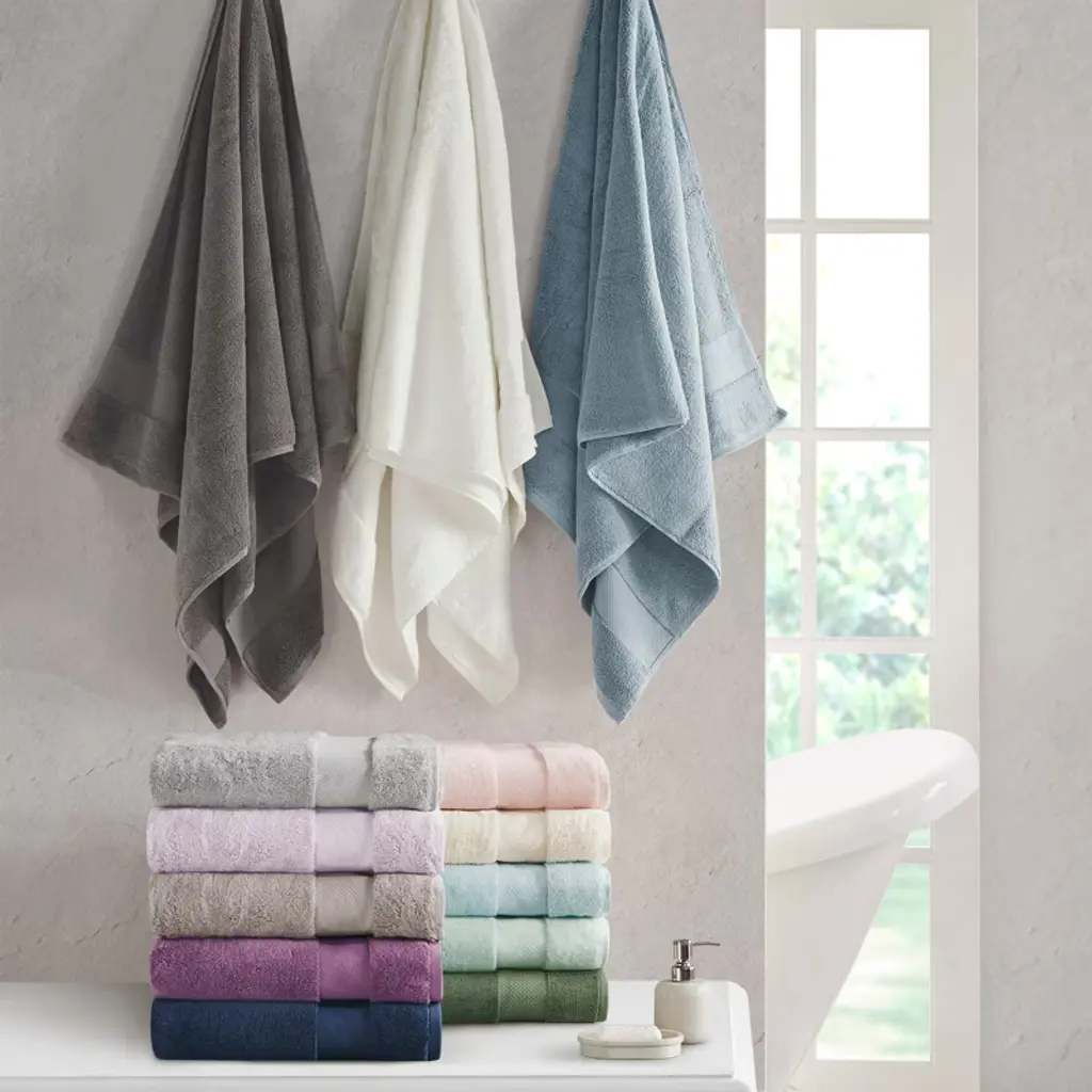 Elevate your bathroom decor with the luxuriously soft and indulgent comfort of our cotton bath towel set. These oversized cotton towels are made from smooth low-twist yarns with 600gsm weight, creating a soft and plush hand feel that is also highly absorbent for the ultimate in luxury. Each towel features a dobby border and end hem to add a classic, yet refined touch to the design; while also Oeko-Tex Certified for superior quality towel. Transform your bathroom into a relaxing spa-like retreat with this luxury complete 6 Piece bath towel set.