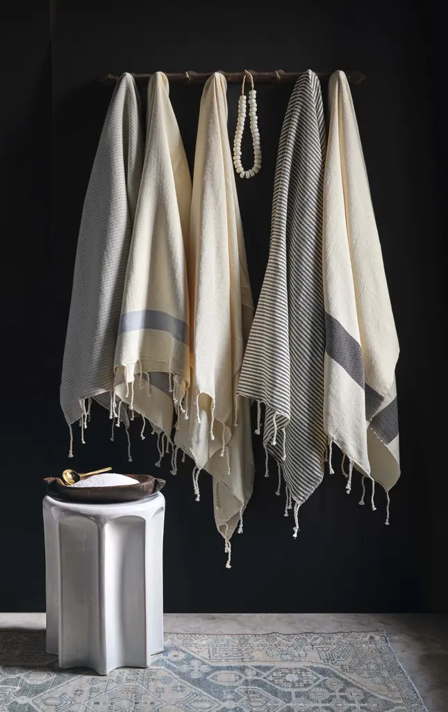 Forget those ordinary terrycloth towels — it’s time to upgrade your bath with a set of our luxe Hammam Cream Diamond Towels. Inspired by the textiles found in traditional Turkish bath houses, these powder room essentials are handwoven in Morocco from soft, lightweight and super absorbent cotton in a goes-with-everything neutral hue. Each one is stitched in a subtle, geometric pattern and finished with textural fringed edges, which together create an effortless, global-chic feel. Must-haves for drying off in the washroom, we also love the Bath Towel as a beach or picnic blanket, while the Hand Towel makes a great tea towel in the kitchen. •100% natural cotton•handwoven •morocco Dimensions hand •25" x 32.5"•fringe: 4.5" long bath•37.5" x 82"•fringe: 4.5" long Care •machine wash on gentle setting with cool water•line dry •launder twice before first use for maximum absorbency