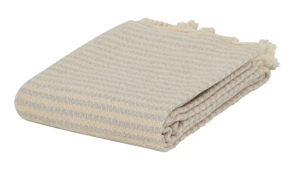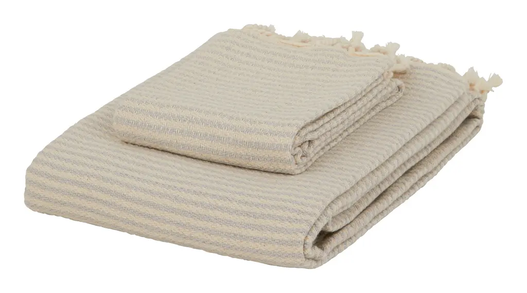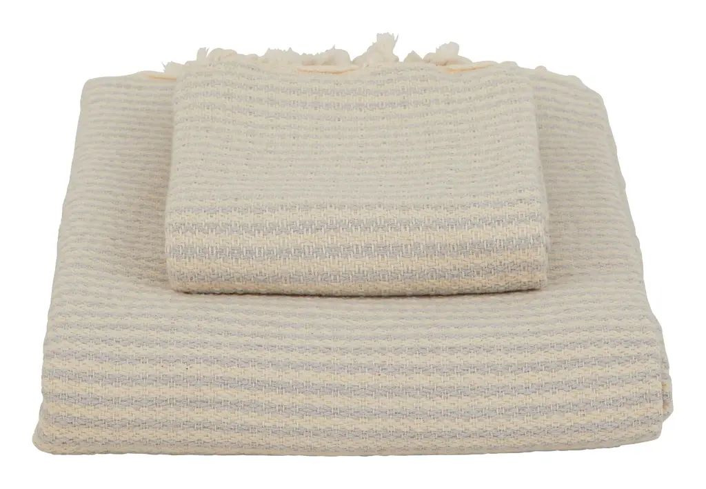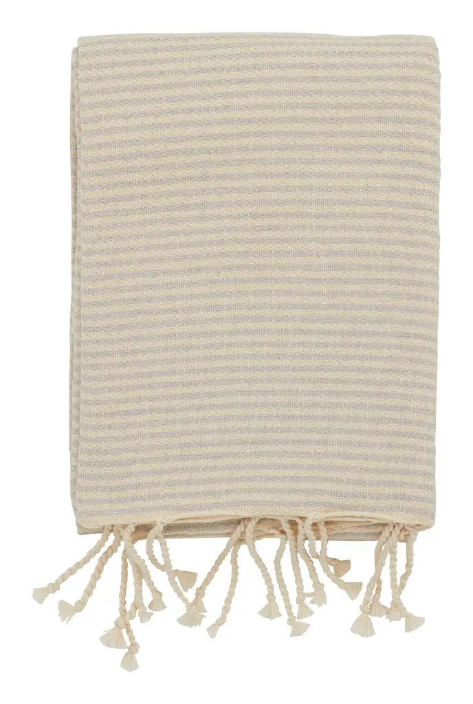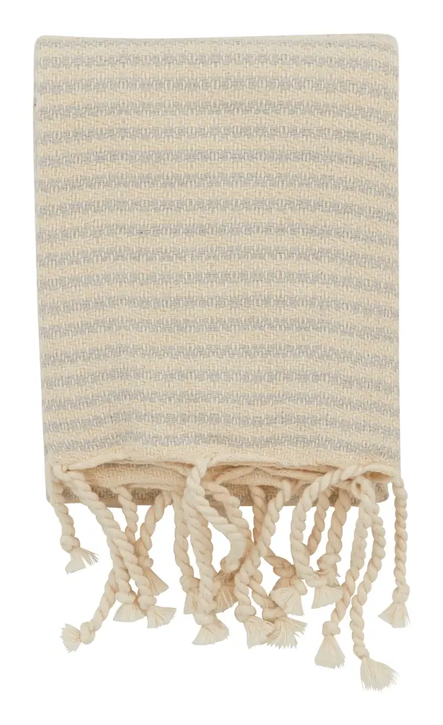 Forget those ordinary terrycloth towels — it’s time to upgrade your bath with a set of our luxe Hammam Grey Striped Towels. Inspired by the textiles found in traditional Turkish bath houses, these powder room essentials are handwoven in Morocco from soft, lightweight and super absorbent cotton. Each one is patterned with classic stripes in a subtle, neutral cream and pale grey palette and finished with textural fringed edges, which together create an effortless, goes-with-everything feel. Must-haves for drying off in the washroom, we also love the Bath Towel as a beach or picnic blanket, while the Hand Towel makes a great tea towel in the kitchen. •100% natural cotton•handwoven •morocco Dimensions hand•25" x 32.5"•fringe: 4.5" long bath•37.5" x 82"•fringe: 4.5" long Care•machine wash on gentle setting with cool water•line dry •launder twice before first use for maximum absorbency