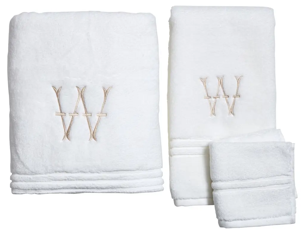 Exclusive to One Kings Lane: The bath towel, hand towel, and washcloth that make up this set are made of zero-twist long-staple cotton. As a result, not only are they wonderfully soft, but they are also especially absorbent, dry quickly, and will outlast other towels. As if that doesn't make this set special enough, the bath towel and the hand towel can be monogrammed in sand-color thread with the initial of your choice, rendered in a distinctive type style.