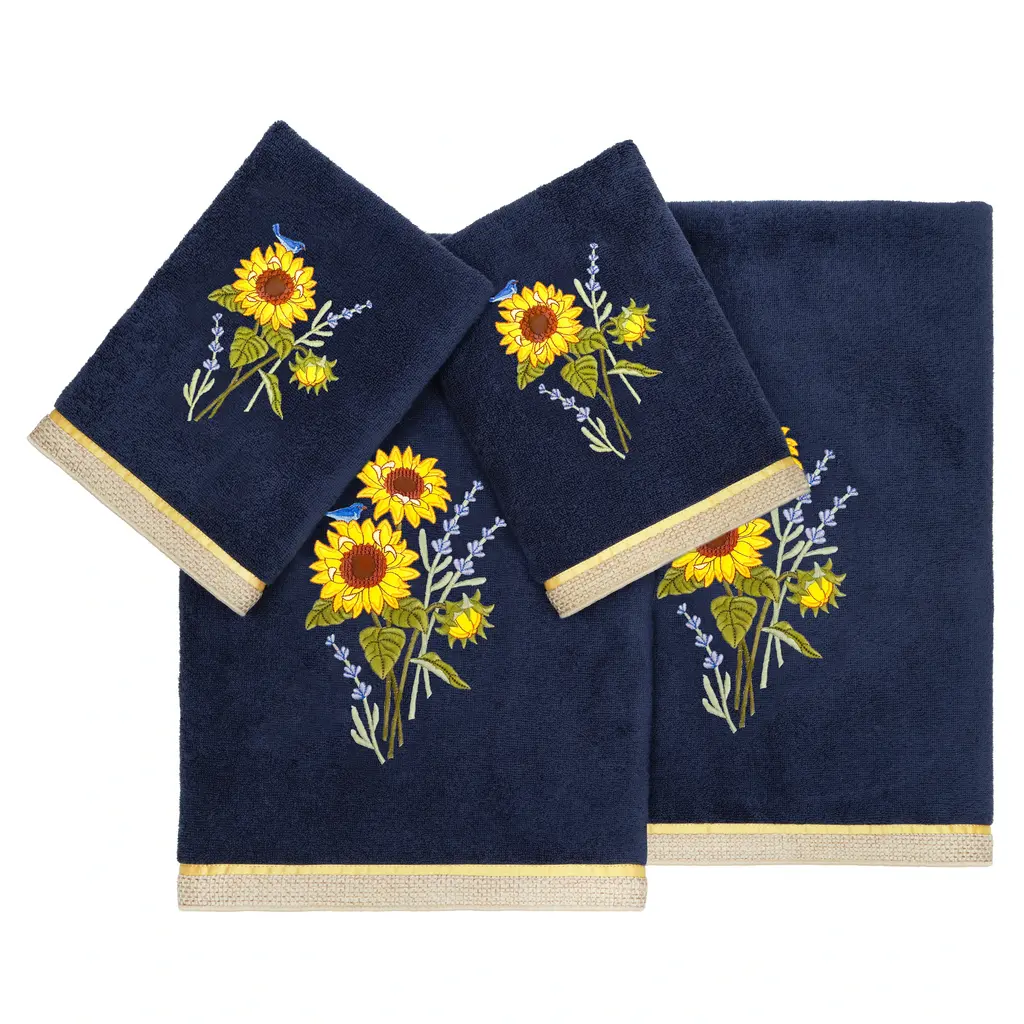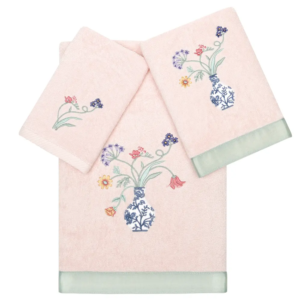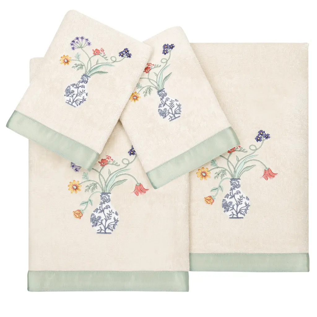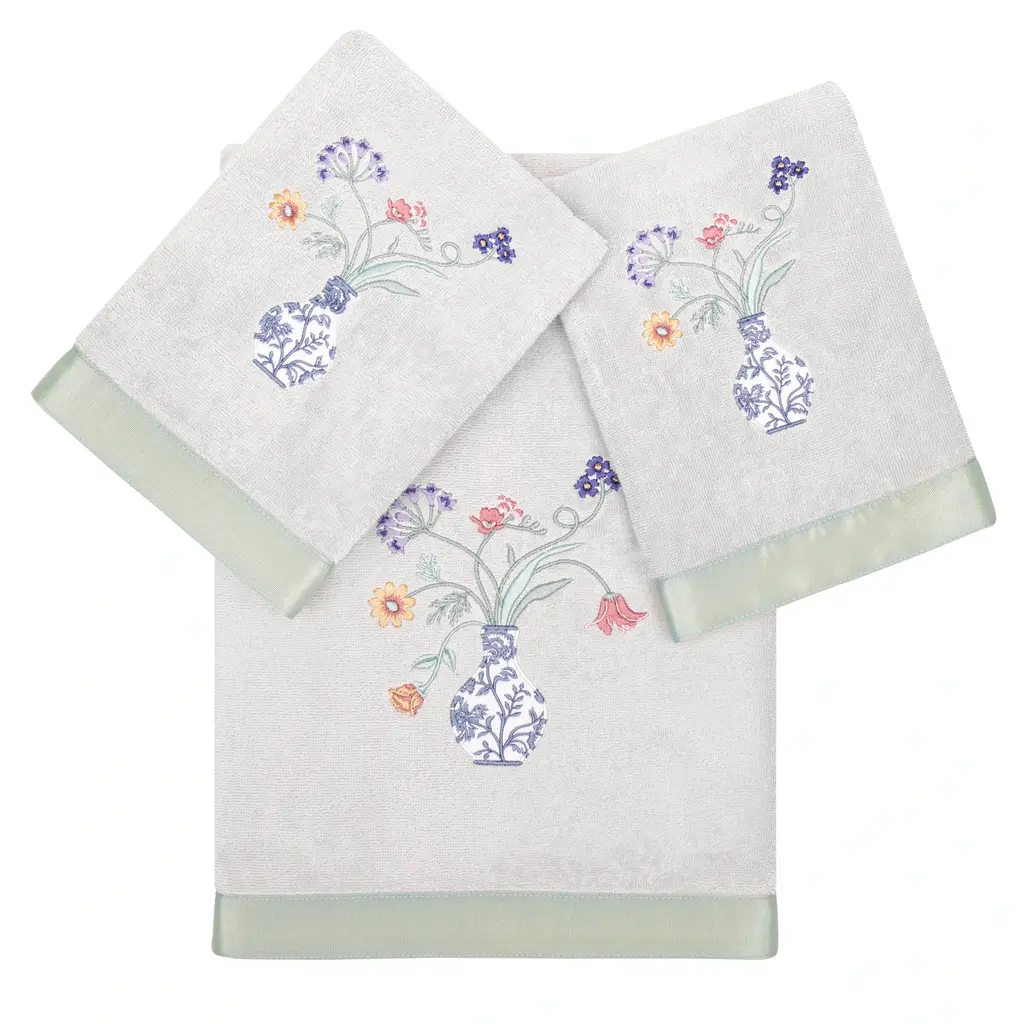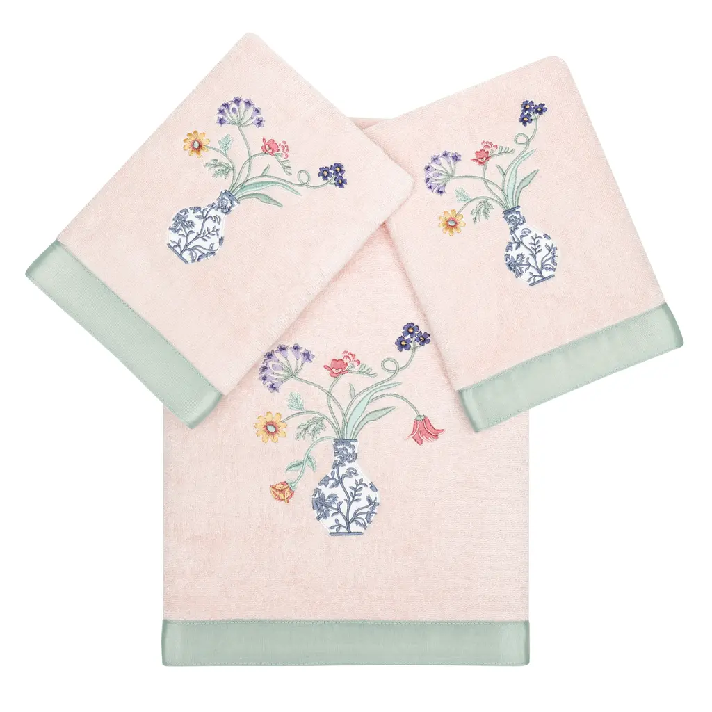 Add a Southwestern touch to your bathroom with the Bonita Bathroom Set. Inspired by classic Talavera pottery, the beautiful floral pattern is here embroidered on a soft cream towel for an elegant addition to your bathroom. Velvety velour reverses to a terry for a soft feel and added absorbency, detailed with a textural dobby. The bright, colorful shades of blue, orange, and turquoise are paired together for a unique, yet versatile color story. Includes: (1) Bath Towel, (1) Hand Towel, and (1) Finger Towel. Measures: Bath Towel - 27"x52", Hand Towel - 16"x32", Finger Towel - 13"x14" Care: Machine wash warm. Tumble dry low or dry clean recommended. No bleach. Material: 95% Cotton, 5% Polyester