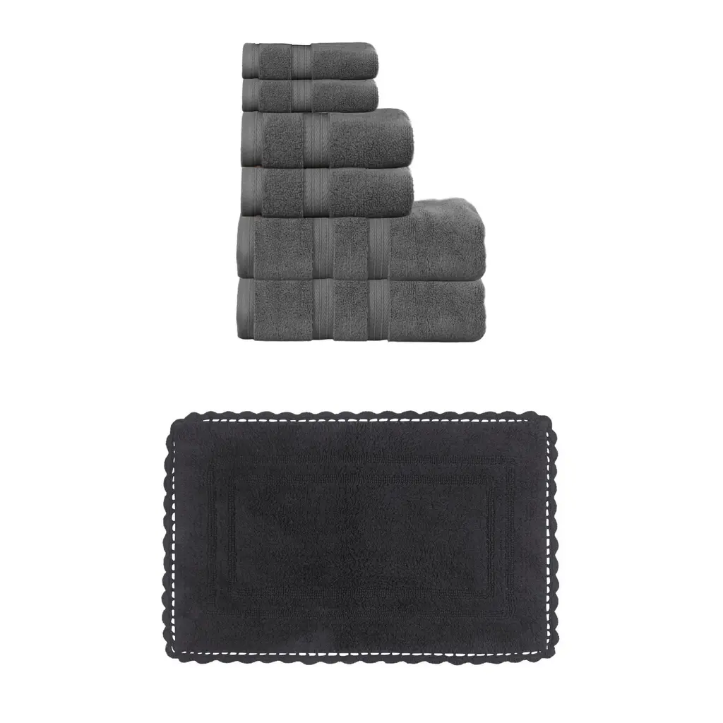 Home Weavers Casual Elegance 100% Soft Cotton 6 Pc Towel Set & 1 Pc Bath Rug, Machine Washable & Non Slip (Set Of 7) - Dark Gray - 24"x40" + 27"x54"(2) + 16"x24"(2) + 13"x13"(2)