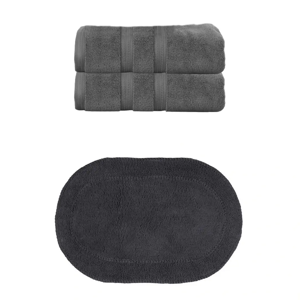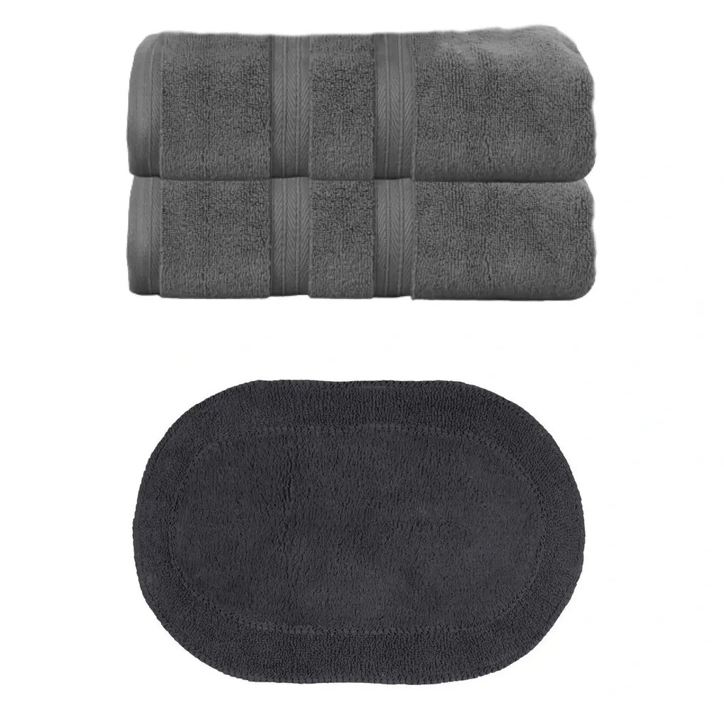 Home Weavers Double Ruffle Collection 100% Soft Cotton 2 Pc Bath Towel Set & 1 Pc 17x24" Bath Rug, Machine Washable (Set Of 3) - Dark Gray - 17"x24" + 27"x54"(2)