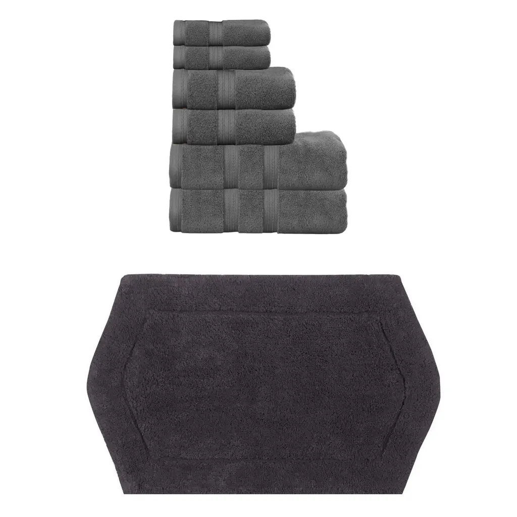 Home Weavers Double Ruffle Collection 100% Soft Cotton 6 Pc Towel Set & 1 Pc 21x34" Bath Rug, Machine Washable (Set Of 7) - Dark Gray - 21"x34" + 27"x54"(2) + 16"x24"(2) + 13"x13"(2)
