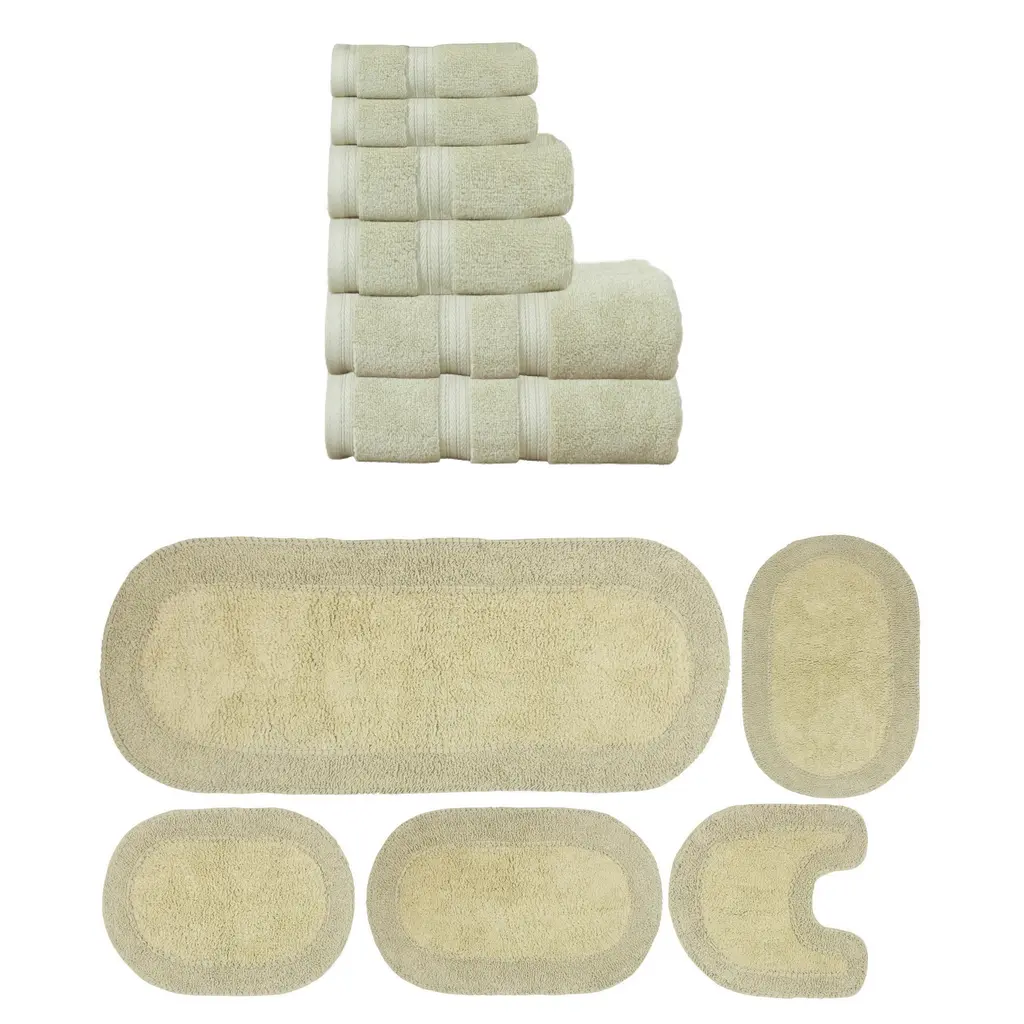 Transform your bathroom into a spa-like retreat with the Home Weavers Double Ruffle Collection. Crafted from 100% cotton, this luxurious bath set combines comfort and elegance to elevate your daily routine. The tufted bath rug, measuring 24"x40", offers plush softness underfoot while absorbing moisture efficiently. Pair it with our Elegance Essential bath towel (27"x54"), hand towel (16"x24"), and washcloth (13"x13") for a coordinated look that enhances any bathroom decor. Treat yourself to the ultimate in comfort and style with the Home Weavers Double Ruffle Collection, where quality meets sophistication. This Nine Piece set Includes :- 1 Piece Bath Rug + 8 pcs Towel Set (2 Bath Towel, 2 Hand Towel, 4 Wash Cloth)
