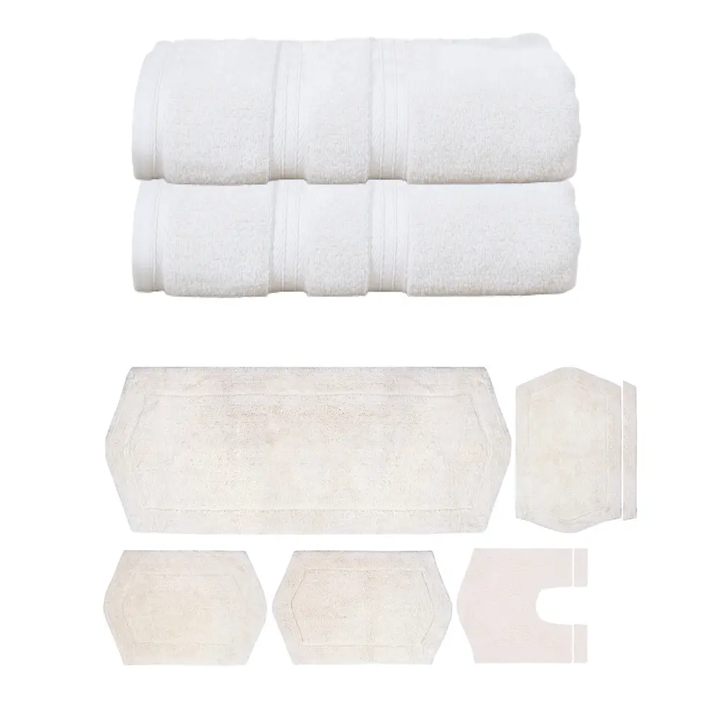Transform your bathroom into a spa-like sanctuary with the Home Weavers 100% Soft Cotton Super Absorbent Bath Towels & Rugs Combo. Made from luxurious zero-twist cotton, these towels and rugs offer unmatched softness and absorbency while being gentle on the skin. The set includes a range of sizes, from plush bath towels to coordinating rugs, all designed to enhance your bathing experience. Each rug features a non-slip backing for safety and convenience, ensuring they stay securely in place. Plus, their machine-washable design makes for effortless maintenance. Elevate your daily routine with this premium combo that combines comfort, durability, and style. Set included: 5 Bath Rug (17"x24" + 21"x34" + 20"x20" + 21"x54" + 24"x40"), 2 Bath Towels (27"x54") Premium Quality: Each piece is crafted with care using 100% cotton for superior comfort and durability. Elegant Design: Enhance your bathroom aesthetic with a choice of sophisticated colors and a tufted & Non Slip bath rug that adds texture and warmth. Practical Comfort: Enjoy the soft, plush feel of the bath rug and the absorbency of the towel set, designed to meet your daily bathing needs. Washing Instructions : Machine-washable design makes for effortless maintenance.