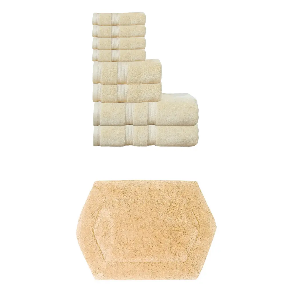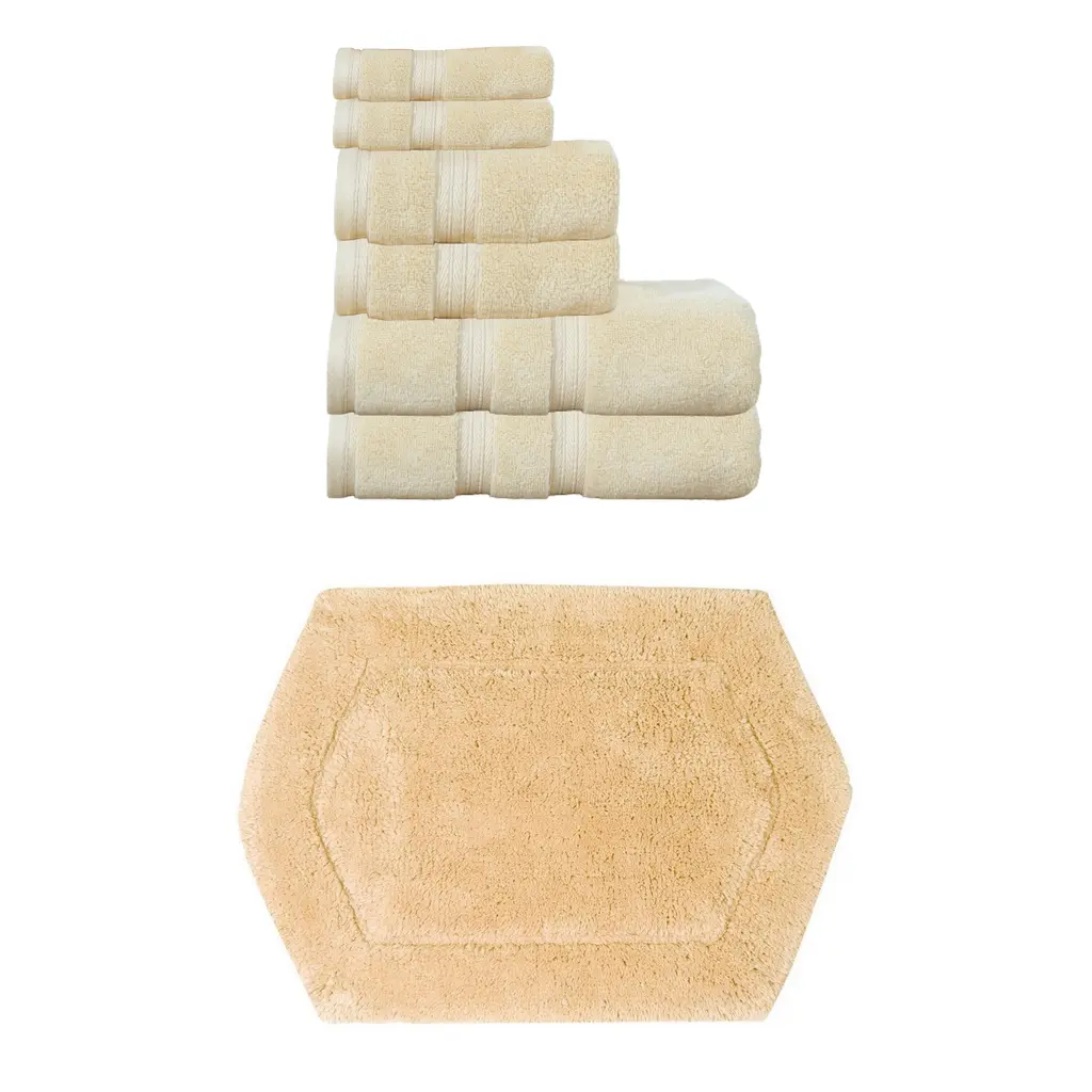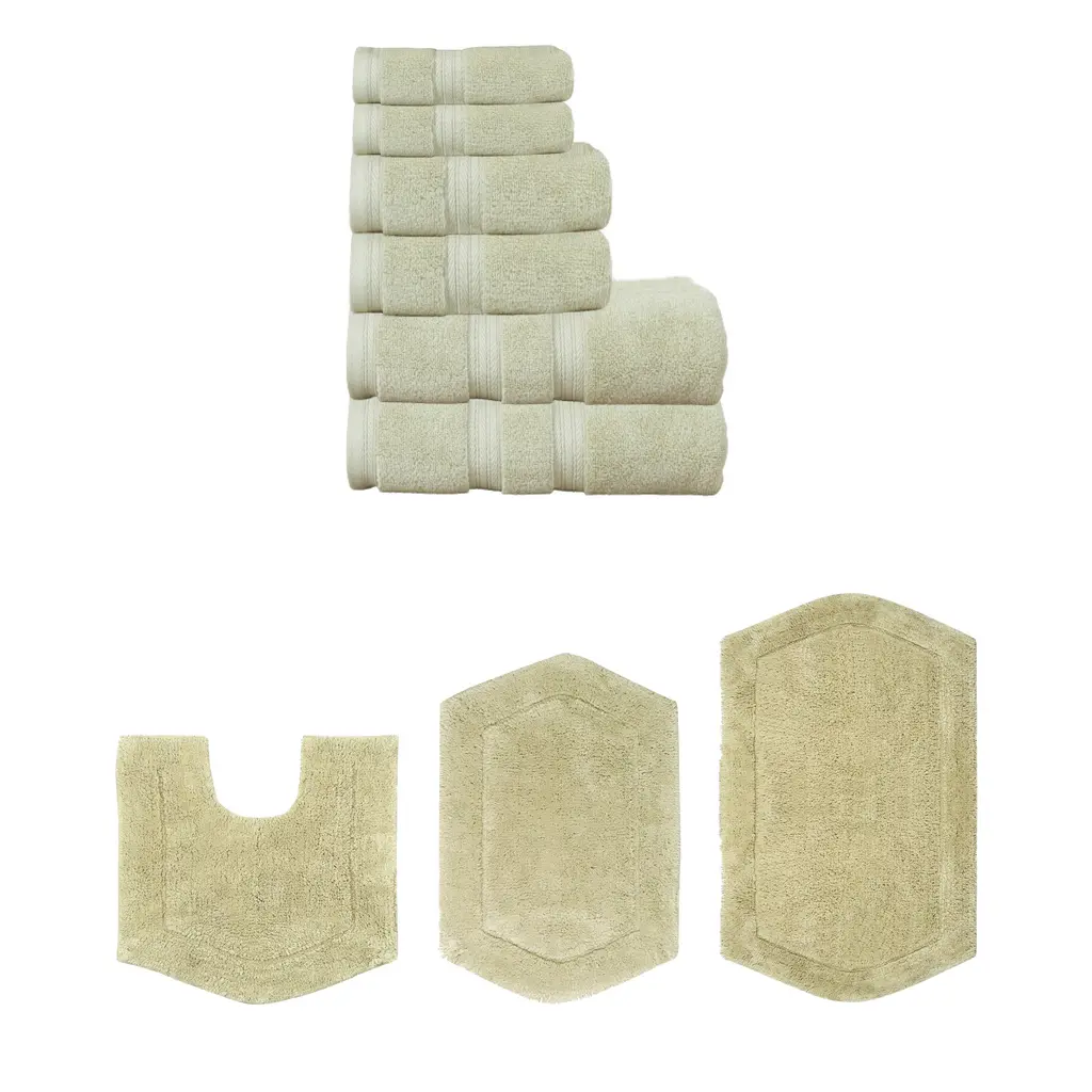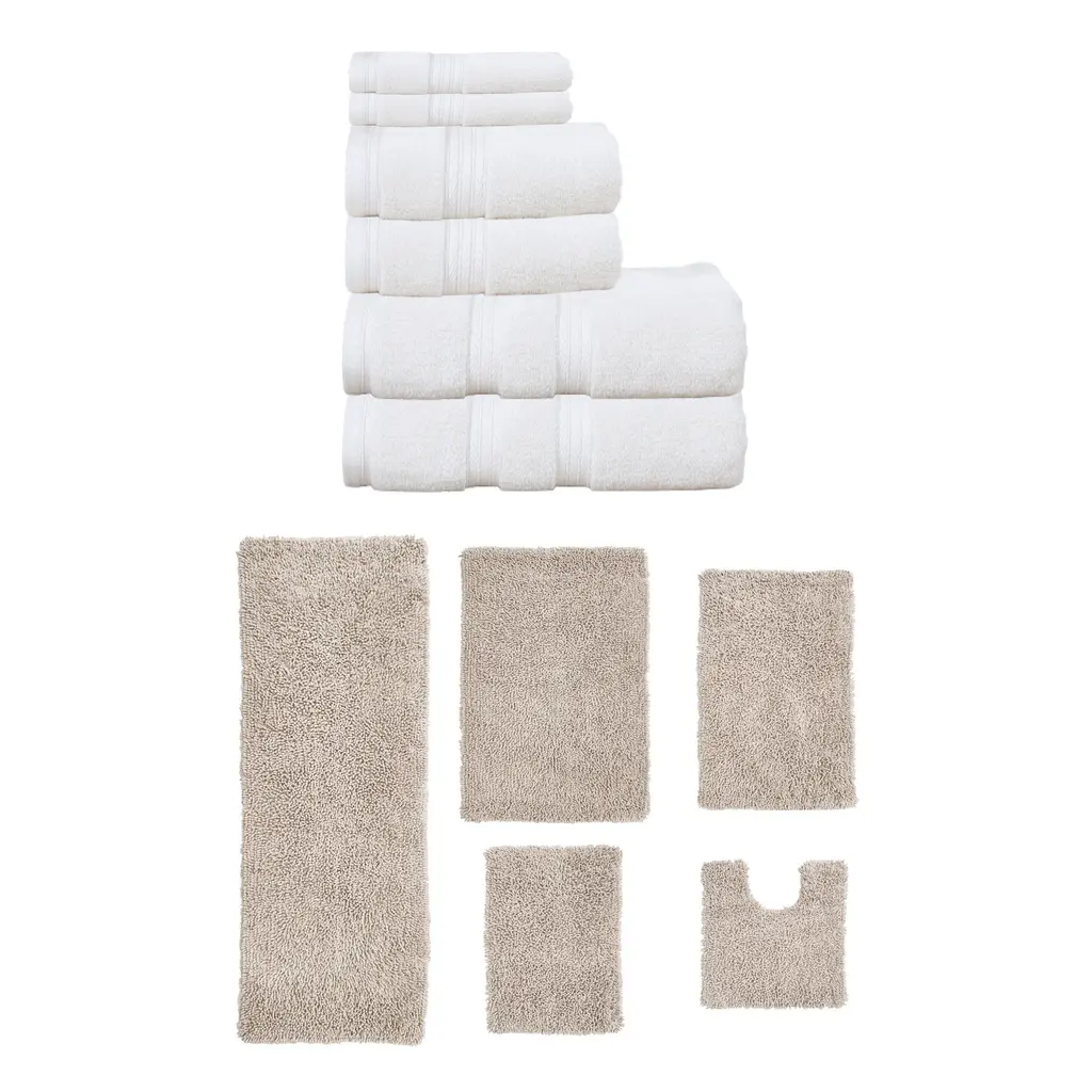 Transform your bathroom into a spa-like sanctuary with the Home Weavers 100% Soft Cotton Super Absorbent Bath Towels & Rugs Combo. Made from luxurious zero-twist cotton, these towels and rugs offer unmatched softness and absorbency while being gentle on the skin. The set includes a range of sizes, from plush bath towels to coordinating rugs, all designed to enhance your bathing experience. Each rug features a non-slip backing for safety and convenience, ensuring they stay securely in place. Plus, their machine-washable design makes for effortless maintenance. Elevate your daily routine with this premium combo that combines comfort, durability, and style. Set included: 3 Bath Rug (17"x24" + 21"x34" + 20"+20"), 2 Bath Towels (27"x54"), 2 Hand Towels (16"x24"), and 2 Wash Cloths (13"x13") Premium Quality: Each piece is crafted with care using 100% cotton for superior comfort and durability. Elegant Design: Enhance your bathroom aesthetic with a choice of sophisticated colors and a tufted & Non Slip bath rug that adds texture and warmth. Practical Comfort: Enjoy the soft, plush feel of the bath rug and the absorbency of the towel set, designed to meet your daily bathing needs. Washing Instructions : Machine-washable design makes for effortless maintenance.