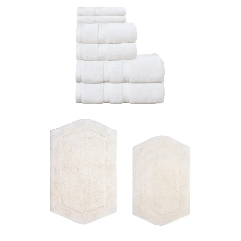 Transform your bathroom into a spa-like sanctuary with the Home Weavers 100% Soft Cotton Super Absorbent Bath Towels & Rugs Combo. Made from luxurious zero-twist cotton, these towels and rugs offer unmatched softness and absorbency while being gentle on the skin. The set includes a range of sizes, from plush bath towels to coordinating rugs, all designed to enhance your bathing experience. Each rug features a non-slip backing for safety and convenience, ensuring they stay securely in place. Plus, their machine-washable design makes for effortless maintenance. Elevate your daily routine with this premium combo that combines comfort, durability, and style. Set included: 4 Bath Rug (17"x24" + 21"x34" + 20"x20" + 22"x60"), 2 Bath Towels (27"x54"), 2 Hand Towels (16"x24"), and 2 Wash Cloths (13"x13") Premium Quality: Each piece is crafted with care using 100% cotton for superior comfort and durability. Elegant Design: Enhance your bathroom aesthetic with a choice of sophisticated colors and a tufted & Non Slip bath rug that adds texture and warmth. Practical Comfort: Enjoy the soft, plush feel of the bath rug and the absorbency of the towel set, designed to meet your daily bathing needs. Washing Instructions : Machine-washable design makes for effortless maintenance.