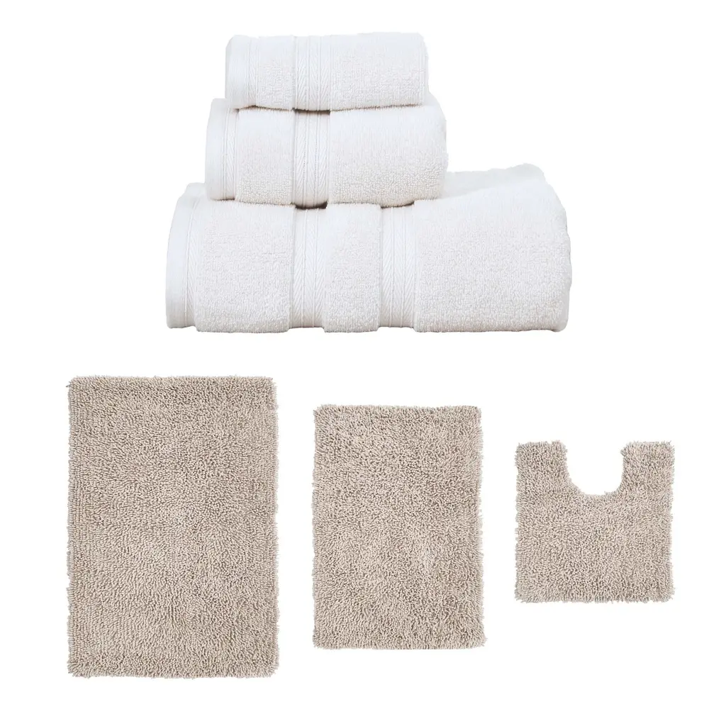 Transform your bathroom into a spa-like sanctuary with the Home Weavers 100% Soft Cotton Super Absorbent Bath Towels & Rugs Combo. Made from luxurious zero-twist cotton, these towels and rugs offer unmatched softness and absorbency while being gentle on the skin. The set includes a range of sizes, from plush bath towels to coordinating rugs, all designed to enhance your bathing experience. Each rug features a non-slip backing for safety and convenience, ensuring they stay securely in place. Plus, their machine-washable design makes for effortless maintenance. Elevate your daily routine with this premium combo that combines comfort, durability, and style. Set included: 3 Bath Rug (17"x24" + 21"x34" + 20"+20"), 2 Bath Towels (27"x54") Premium Quality: Each piece is crafted with care using 100% cotton for superior comfort and durability. Elegant Design: Enhance your bathroom aesthetic with a choice of sophisticated colors and a tufted & Non Slip bath rug that adds texture and warmth. Practical Comfort: Enjoy the soft, plush feel of the bath rug and the absorbency of the towel set, designed to meet your daily bathing needs. Washing Instructions : Machine-washable design makes for effortless maintenance.