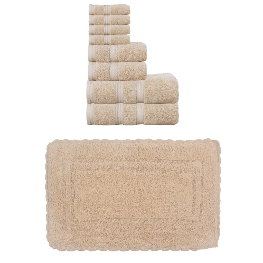 Home Weavers Luxury Collection 100% Soft Cotton 8 Pc Bath Towel Set & 1 Pc 17x24" Bath Rug, Machine Wash & Non Slip (Set Of 9) - Linen - 17"x24" + 27"x54"(2) + 16"x24"(2) + 13"x13"(4)