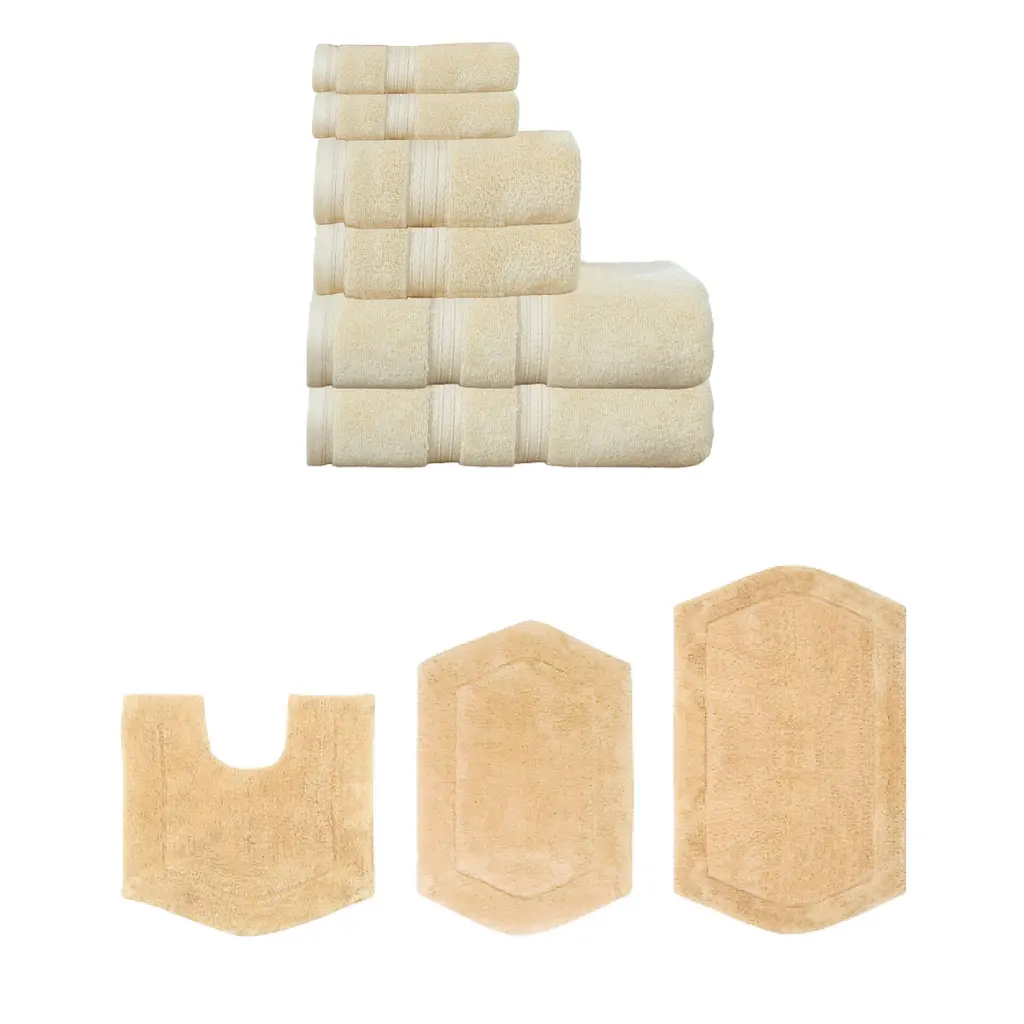 Transform your bathroom into a spa-like sanctuary with the Home Weavers 100% Soft Cotton Super Absorbent Bath Towels & Rugs Combo. Made from luxurious zero-twist cotton, these towels and rugs offer unmatched softness and absorbency while being gentle on the skin. The set includes a range of sizes, from plush bath towels to coordinating rugs, all designed to enhance your bathing experience. Each rug features a non-slip backing for safety and convenience, ensuring they stay securely in place. Plus, their machine-washable design makes for effortless maintenance. Elevate your daily routine with this premium combo that combines comfort, durability, and style. Set included: 3 Bath Rug (17"x24" + 21"x34" + 20"+20"), 2 Bath Towels (27"x54"), 2 Hand Towels (16"x24"), and 2 Wash Cloths (13"x13") Premium Quality: Each piece is crafted with care using 100% cotton for superior comfort and durability. Elegant Design: Enhance your bathroom aesthetic with a choice of sophisticated colors and a tufted & Non Slip bath rug that adds texture and warmth. Practical Comfort: Enjoy the soft, plush feel of the bath rug and the absorbency of the towel set, designed to meet your daily bathing needs. Washing Instructions : Machine-washable design makes for effortless maintenance.