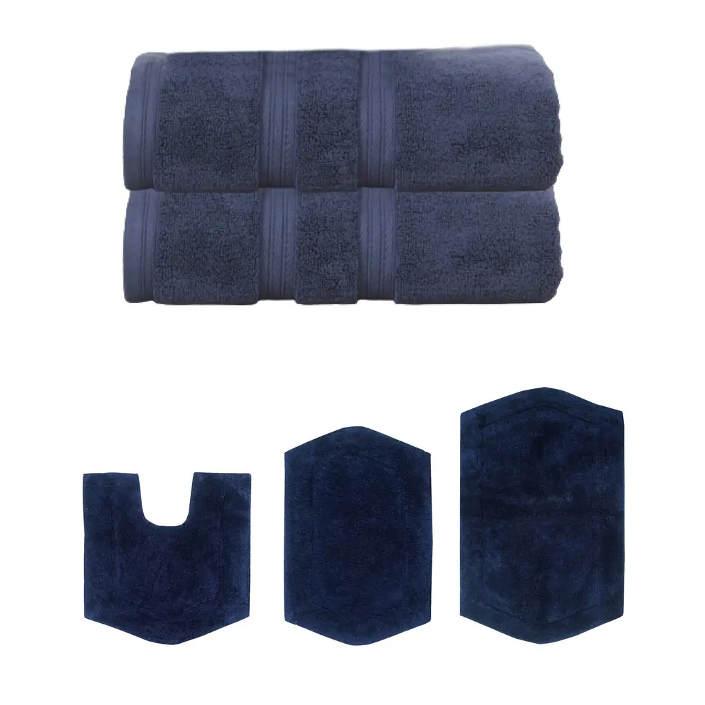 Home Weavers Waterford Collection 100% Soft Cotton Super Absorbent 6 Pc Towel Set & 3 Pc Bath Rug Combo, Non Slip (Set Of 9) - Navy - 3 Pc Bath Rug + 6 Pc Towel Set