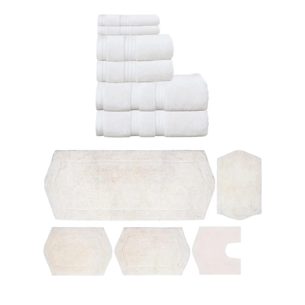 Transform your bathroom into a spa-like sanctuary with the Home Weavers 100% Soft Cotton Super Absorbent Bath Towels & Rugs Combo. Made from luxurious zero-twist cotton, these towels and rugs offer unmatched softness and absorbency while being gentle on the skin. The set includes a range of sizes, from plush bath towels to coordinating rugs, all designed to enhance your bathing experience. Each rug features a non-slip backing for safety and convenience, ensuring they stay securely in place. Plus, their machine-washable design makes for effortless maintenance. Elevate your daily routine with this premium combo that combines comfort, durability, and style. Set included: 5 Bath Rug (17"x24" + 21"x34" + 20"x20" + 22"x60" + 24"x40"), 2 Bath Towels (27"x54"), 2 Hand Towels (16"x24"), and 2 Wash Cloths (13"x13") Premium Quality: Each piece is crafted with care using 100% cotton for superior comfort and durability. Elegant Design: Enhance your bathroom aesthetic with a choice of sophisticated colors and a tufted & Non Slip bath rug that adds texture and warmth. Practical Comfort: Enjoy the soft, plush feel of the bath rug and the absorbency of the towel set, designed to meet your daily bathing needs. Washing Instructions : Machine-washable design makes for effortless maintenance.