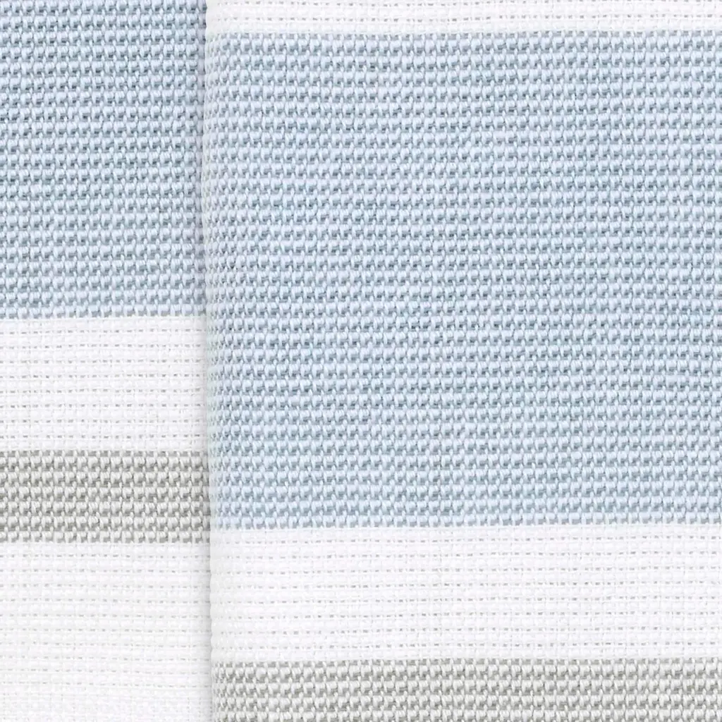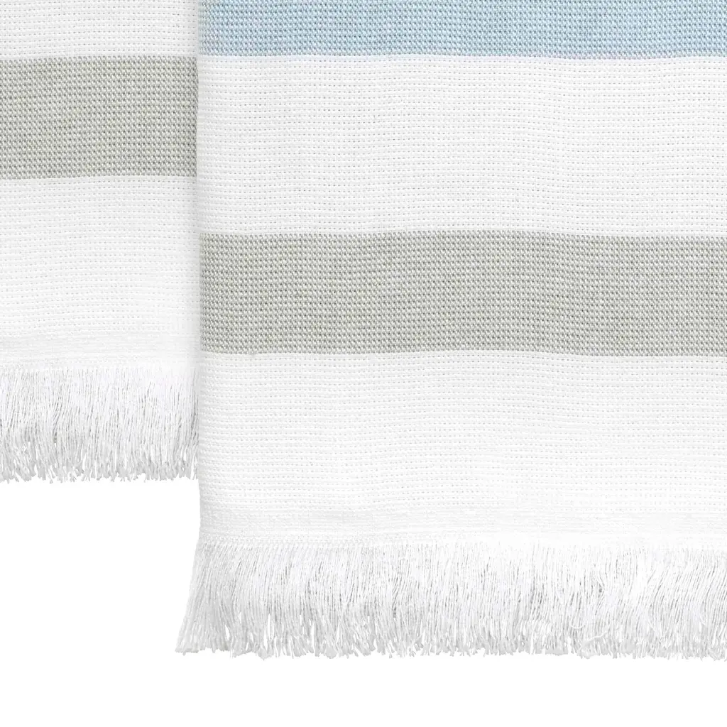 The Izod Clubhouse Stripe Blue 2-Pack Hammam Bath Towel Set features a medium blue, grey and white woven stripe design finished with fringe on both ends. The hammam-style towel is flat woven on one side and reverses to terry--lightweight and fast-drying. 100% cotton, two 30" x 56" towels.