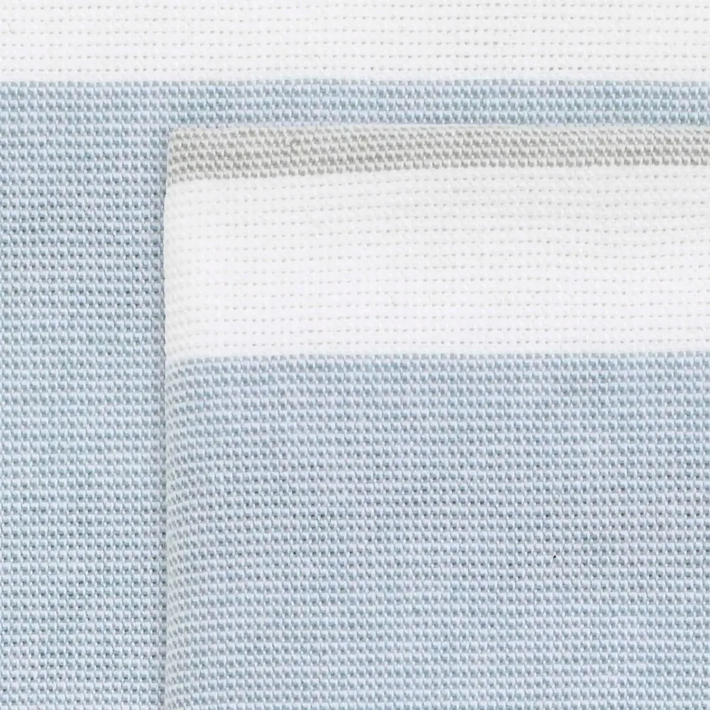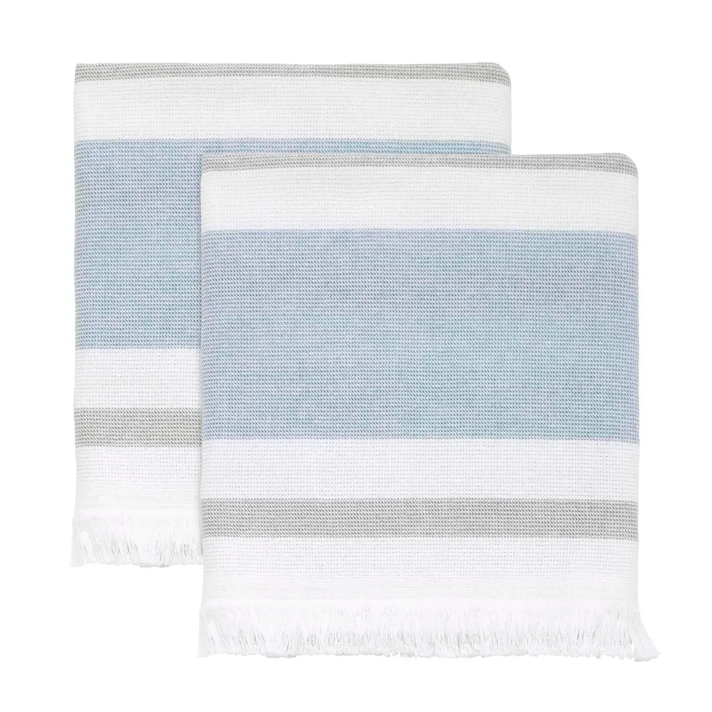 The Izod Clubhouse Stripe Blue 2-Pack Hammam Hand Towel Set features a medium blue, grey and white woven stripe design finished with fringe on both ends. The hammam-style towel is flat woven on one side and reverses to terry--lightweight and fast-drying. 100% cotton, two 16" x 28" towels.