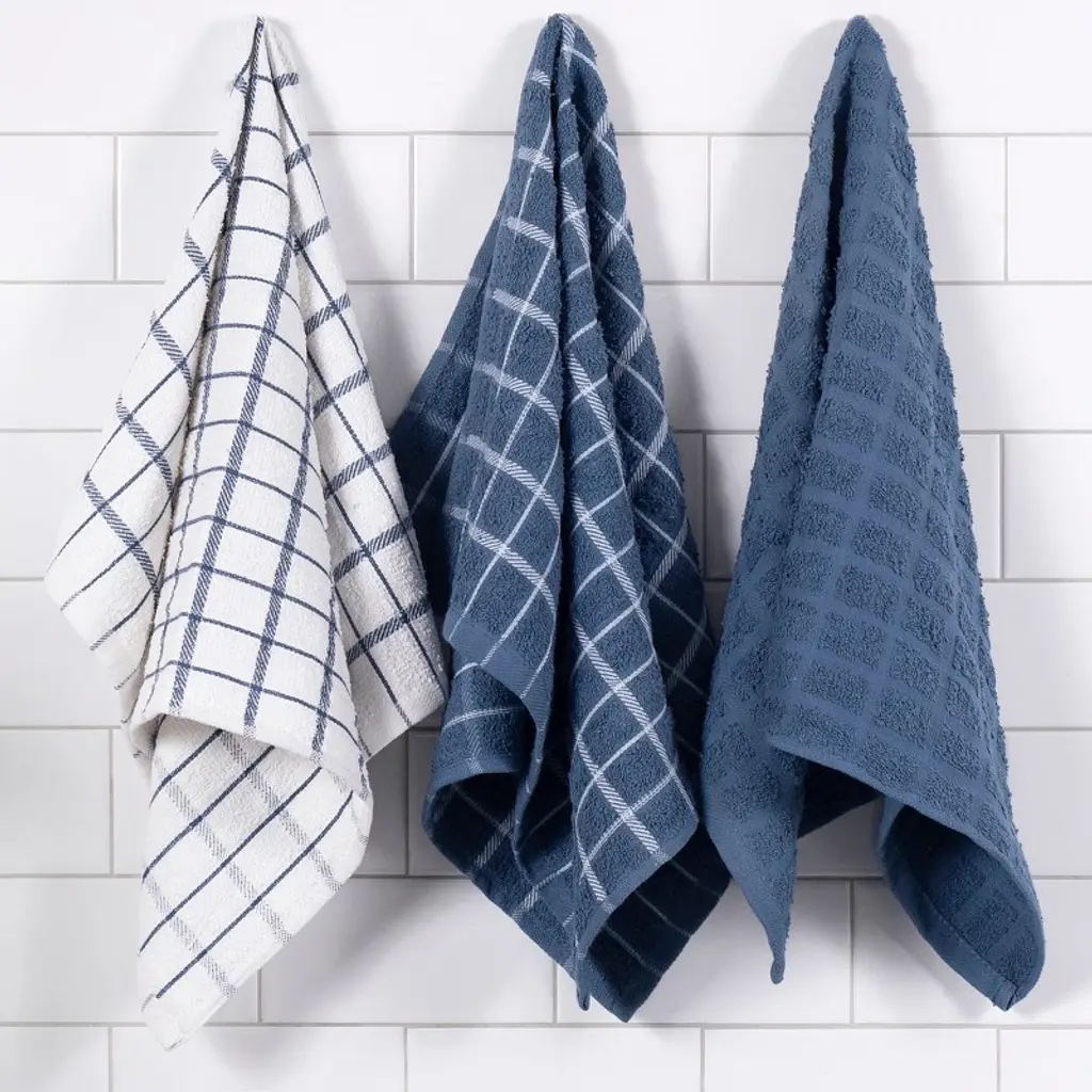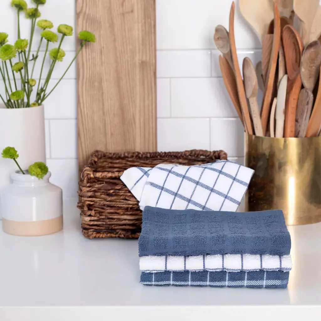 Sturdy as they are soft this set of 3 RITZ Terry Check Kitchen Towels offers durable effectiveness throughout the home no matter how tall the task. Crafted with 100% cotton and featuring terry-loop construction these absorbent towels are designed with a special woven technology that makes them perfect for drying dishes and wiping down surfaces. Ample 15 in. by 25 in. (40 cm by 63 cm) sizing ensures these versatile towels tackle tasks with ease and a variety of charming colors ensures they look good doing it. Machine washable for hassle-free cleaning. Set of 3 kitchen towels. Includes: 1 solid-colored towel 1 dark check-patterned towel and 1 light check-patterned towel. Designed with a "wave" terry-loop construction featuring special woven technology. 15 in. by 25 in. (40 cm by 63 cm). Machine washable.