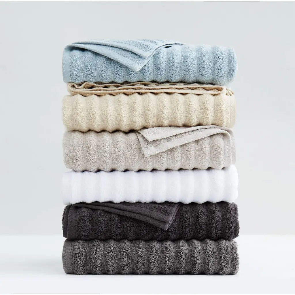 Zero Twist Ribbed 6 Piece Towel Set made from 100% cotton. Includes: two bath towels 30 by 54 inches, two hand towels 16 by 28 inches and two wash cloths 12 by 12 inches. These towels use 100% cotton, zero twist yarns for greater absorption and a soft hand. This item is machine washable, but please be sure to use appropriate sized machinery to avoid any excess wear on the items.