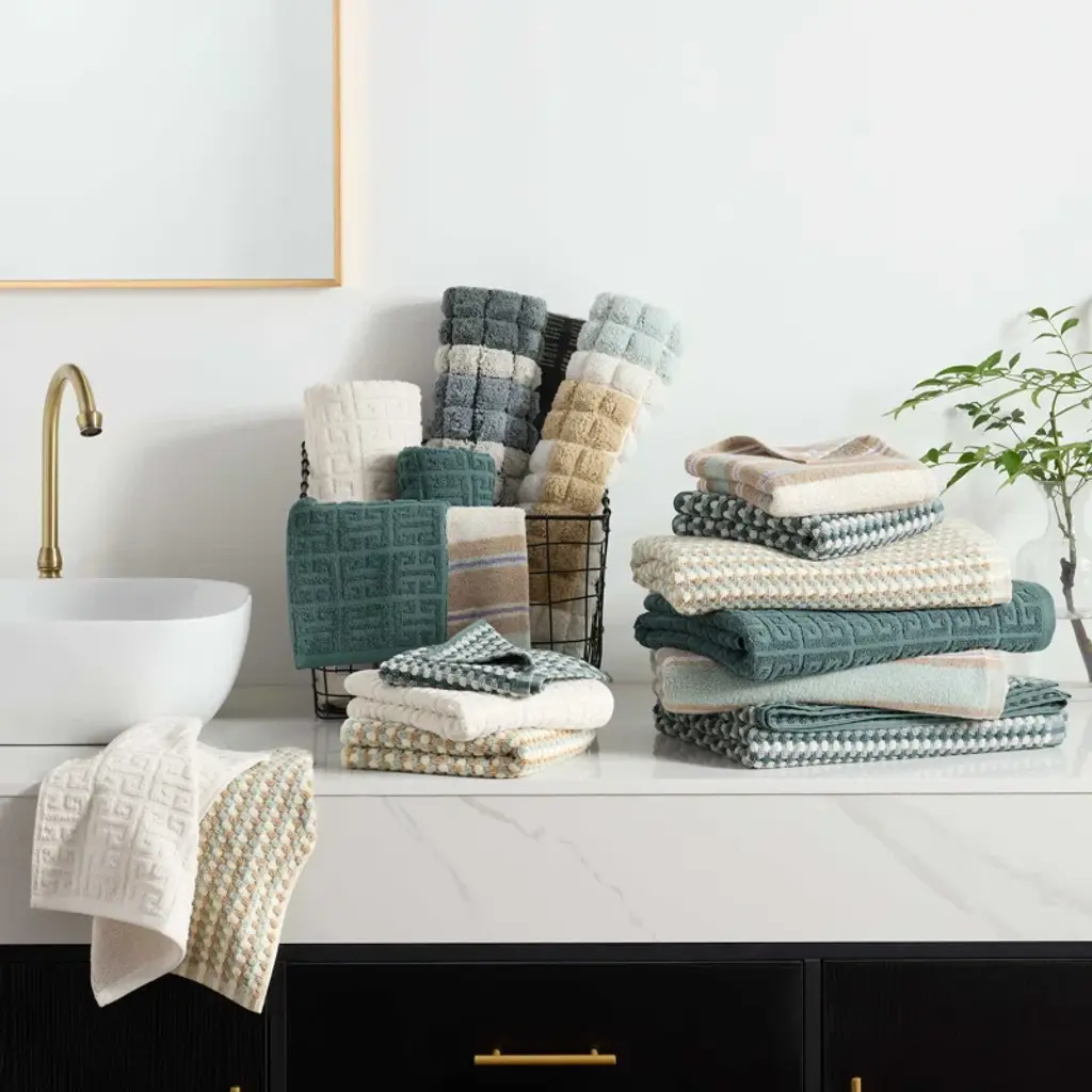 A Greek key pattern sculpted into 100% Cotton Terry gives the Terra Hand Towel an air of sophisticated elegance. The neutral color and design of this hand towel evolves your bathroom to a space of sanctuary. The plush cotton is soft-to-the-touch with super absorbency. The Martex Arcadia Collection offers a selection of specially tailored bedding and bath products that bring forth a sense of understated luxury to your home.