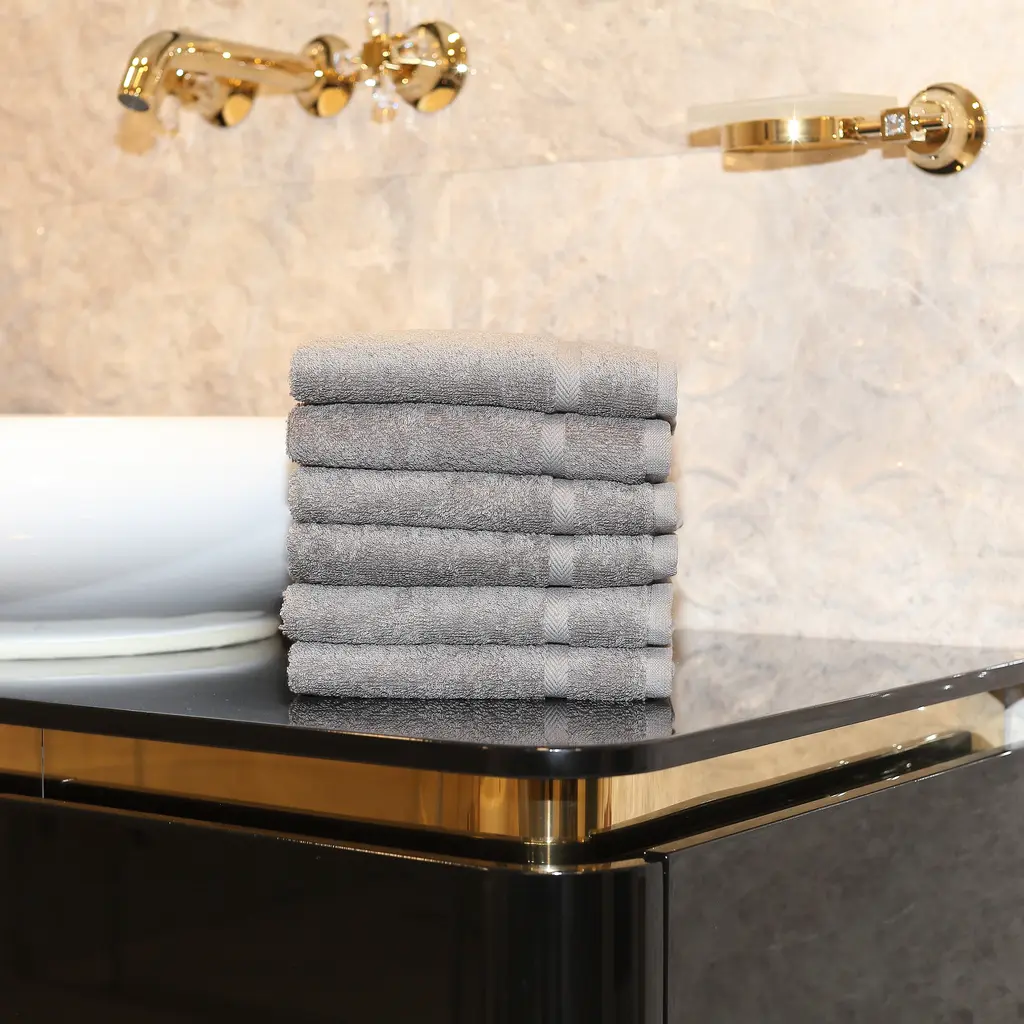 Mediterranean towel 6pc set made of the finest 100% cotton mingled yarn. Solid body with fringed border. Available in classic silver. Highly absorbent and machine washable. 6pc set contains 2 Bath, 2 Hand, 2 Wash. 100% Cotton Mingled Yarn Fringed border Highly Absorbent Stands up to many washings Made in India