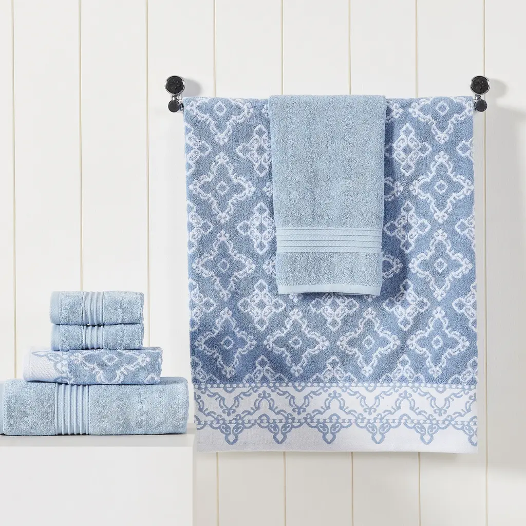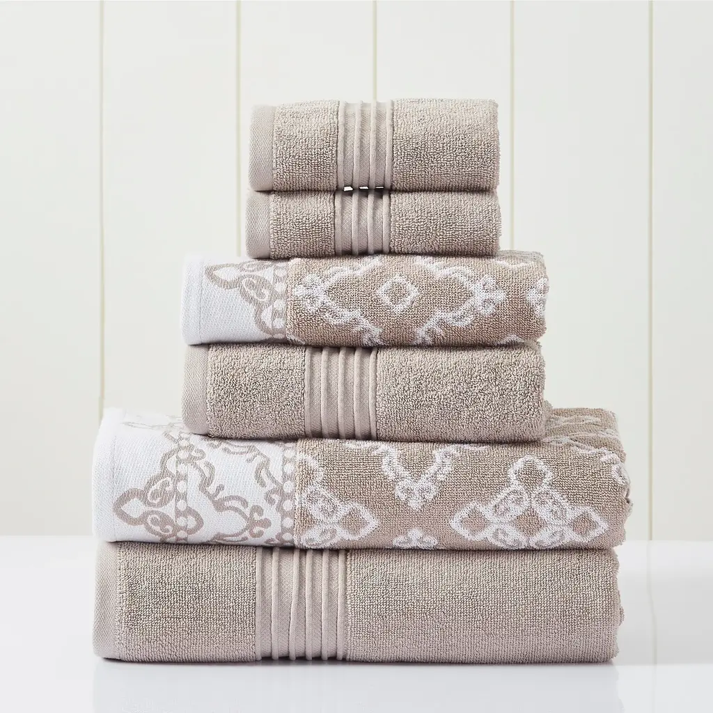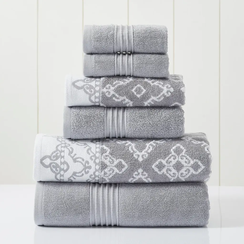 This set is the perfect complement to any bathroom whether you use it to pamper yourself or reserve it for special guests. These towels will feel cozy and comfortable against your skin every time you use them. Half of the set features a solid color design, while the other half is a yarn dyed jacquard pattern that adds texture and beauty to this gorgeous set. Additionally, the towels get softer with washing and drying. Oeko-Tex certified, the definitive mark of excellence for products that are healthy for you and healthy for the environment. Features Materials: 100% Combed Cotton Set Includes: (2) Bath towel, (2) Hand towel, (2) Washcloth Measures: Bath - 27x54 inches, Hand - 16x28 inches, Wash -13x13 inches Oeko-Tex® certified, the definitive mark of excellence for products that are healthy for you and healthy for the environment Features: These 550 GSM towels become softer with every wash. Care Instruction: Machine washable and dryer safe. Recommended - Machine wash gentle cycle with cold water. Sun dry or low tumble dry.