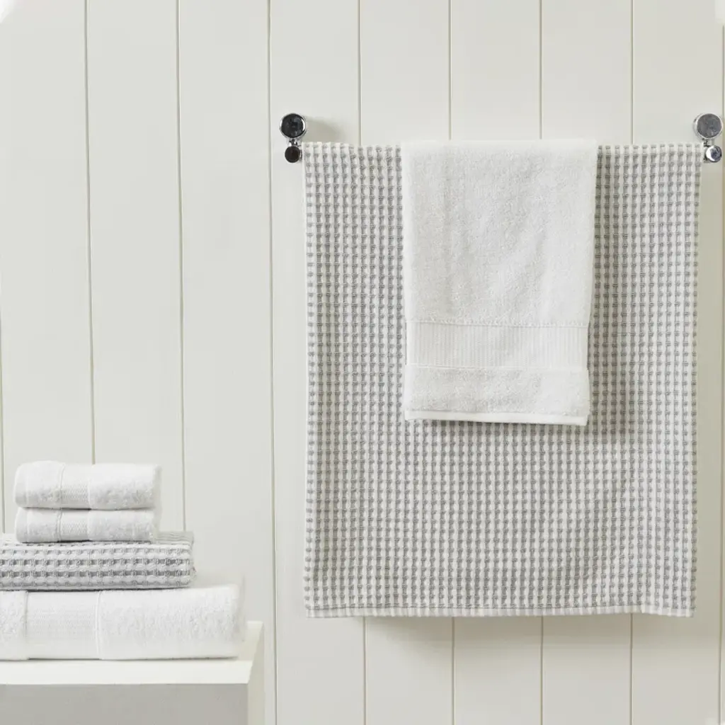 With the popularity of waffle fabrics and weaves, this towel set was inspired by the casual subtleties of easy living. A beautifully textured jacquard design with a two-tone appeal will enhance any bathroom. Soft tonal combinations in the jacquard towels are paired with a solid terry coordinate towel set for the perfect look. The solid towels have a simple dotted ticking stripe dobby that mimics the jacquard design on a smaller scale for great balance. Absorbent and wonderfully soft, your guests will want to take these home with them.