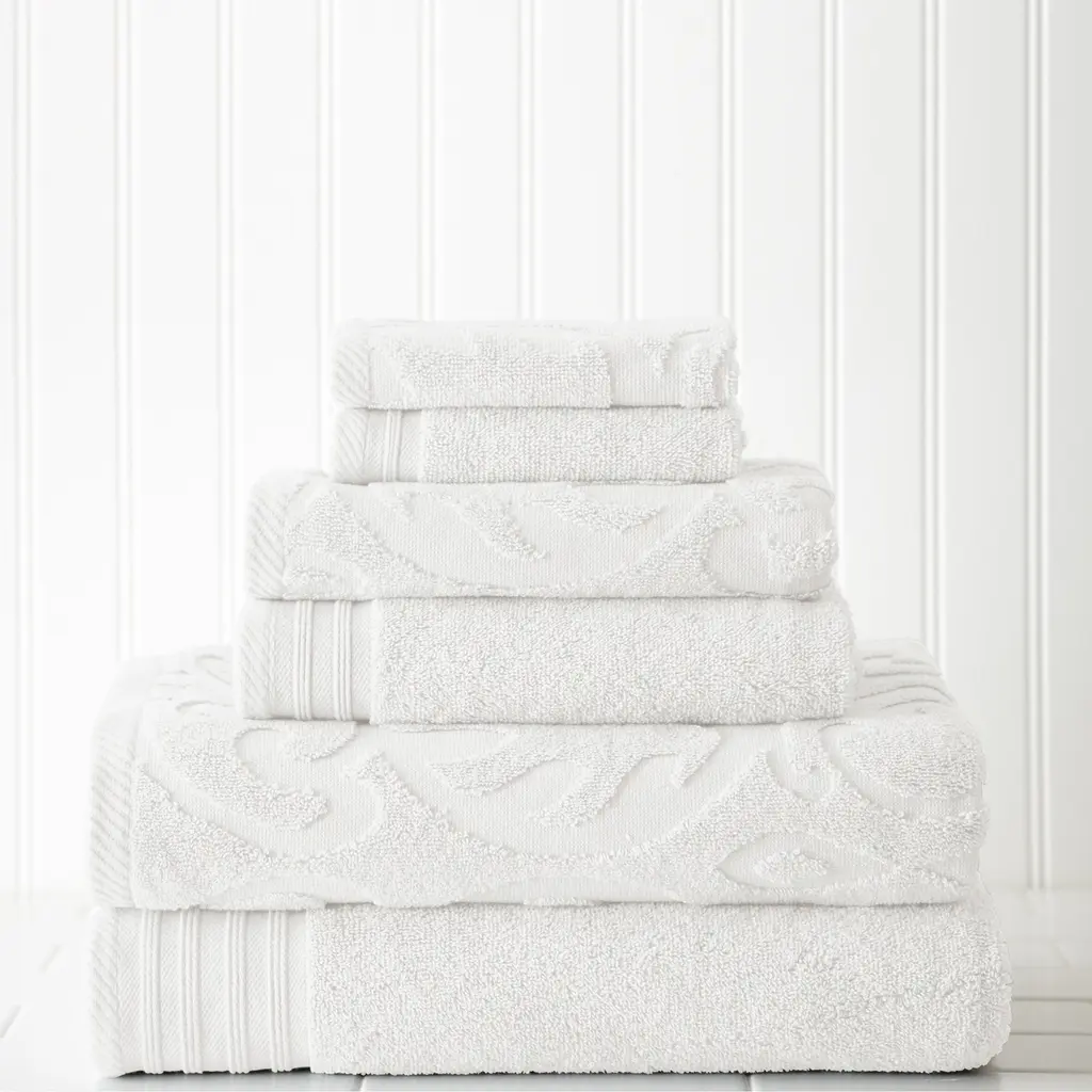 Elevate your bathroom decor with the Modern Threads Jacquard/ Solid Medallion Swirl 6-piece Towel Set. Made of plush cotton, this set is designed with a transitional style featuring a gorgeous medallion pattern and a striped border. Available in 10 versatile colors, these towels are quick-drying and machine washable, making them perfect for everyday use. The set includes 2 bath towels, 2 hand towels, and 2 wash cloths.Features:Dimensions: