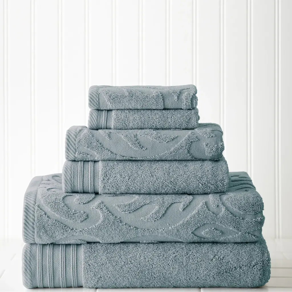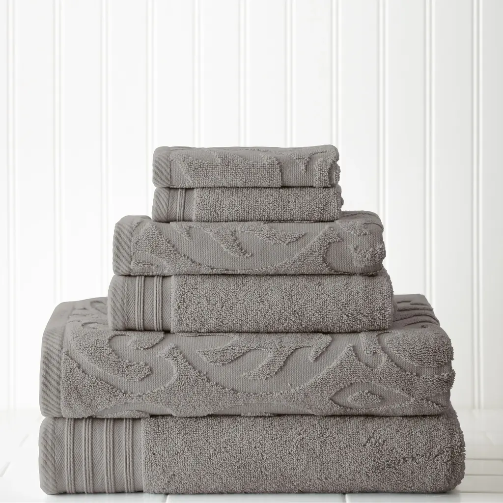 Elevate your bathroom decor with the Modern Threads Jacquard/ Solid Medallion Swirl 6-piece Towel Set. Made of plush cotton, this set is designed with a transitional style featuring a gorgeous medallion pattern and a striped border. Available in 10 versatile colors, these towels are quick-drying and machine washable, making them perfect for everyday use. The set includes 2 bath towels, 2 hand towels, and 2 wash cloths.Features:Dimensions: