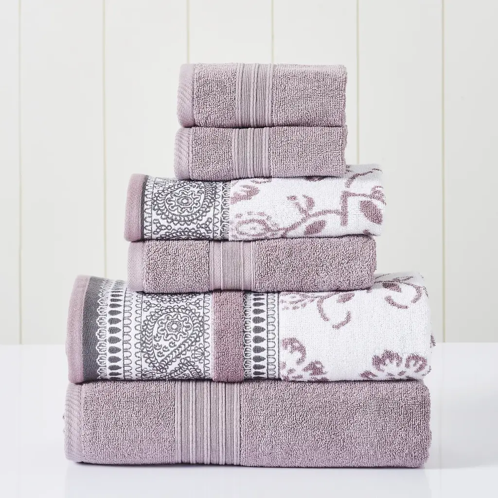 This set is the perfect complement to any bathroom whether you use it to pamper yourself or reserve it for special guests. These towels will feel cozy and comfortable against your skin every time you use them. Half of the set features a solid color design, while the other half is a yarn dyed jacquard pattern that adds texture and beauty to this gorgeous set. Additionally, the towels get softer with washing and drying. Oeko-Tex certified, the definitive mark of excellence for products that are healthy for you and healthy for the environment. Features Materials: 100% Combed Cotton Set Includes: (2) Bath towel, (2) Hand towel, (2) Washcloth Measures: Bath - 27x54 inches, Hand - 16x28 inches, Wash -13x13 inches Oeko-Tex® certified, the definitive mark of excellence for products that are healthy for you and healthy for the environment Features: These 550 GSM towels become softer with every wash. Care Instruction: Machine washable and dryer safe. Recommended - Machine wash gentle cycle with cold water. Sun dry or low tumble dry.