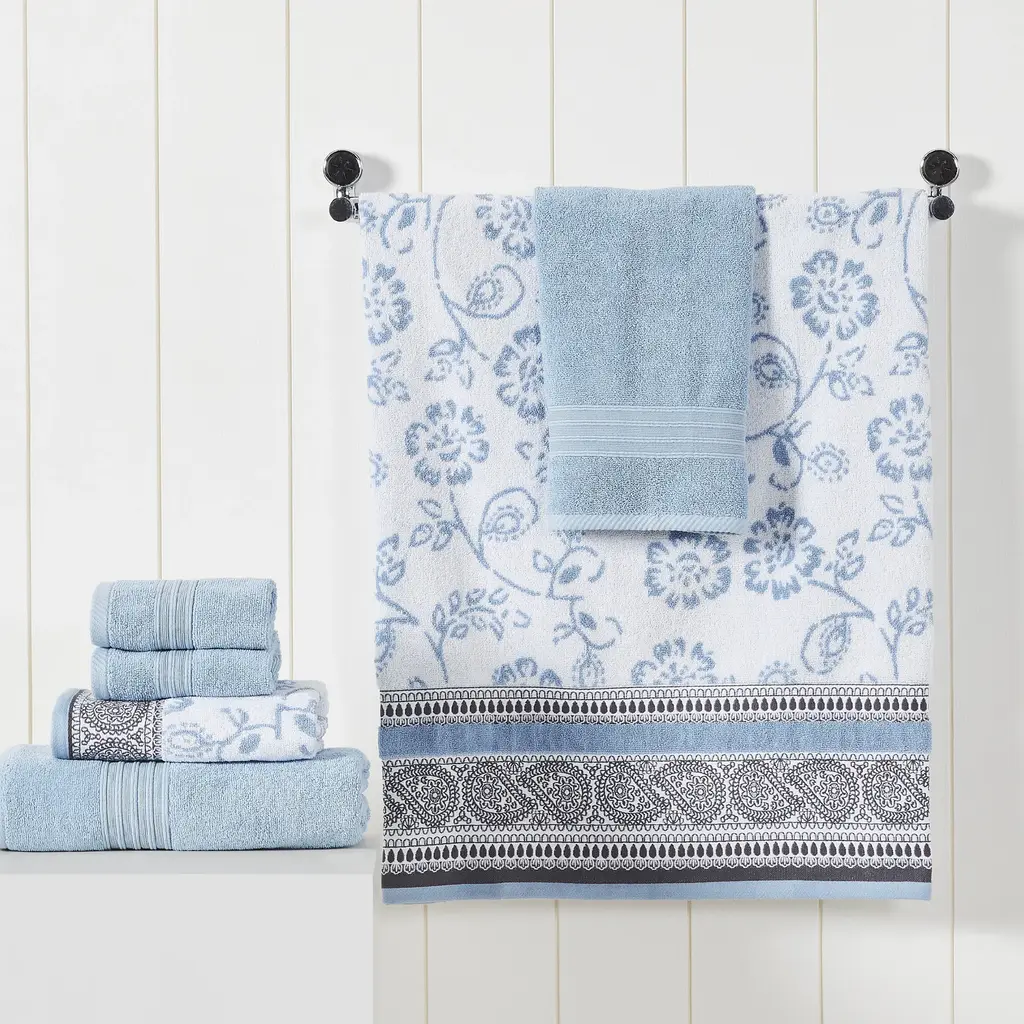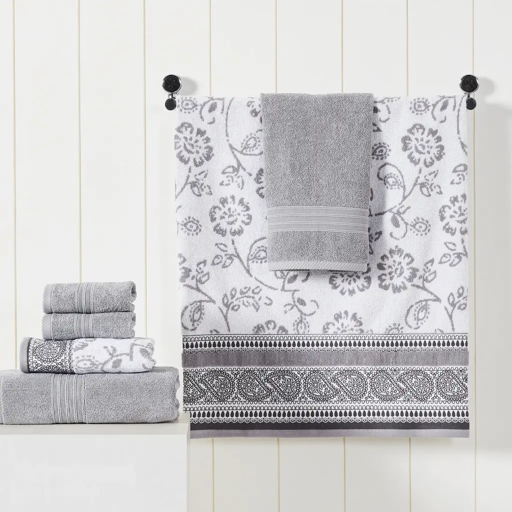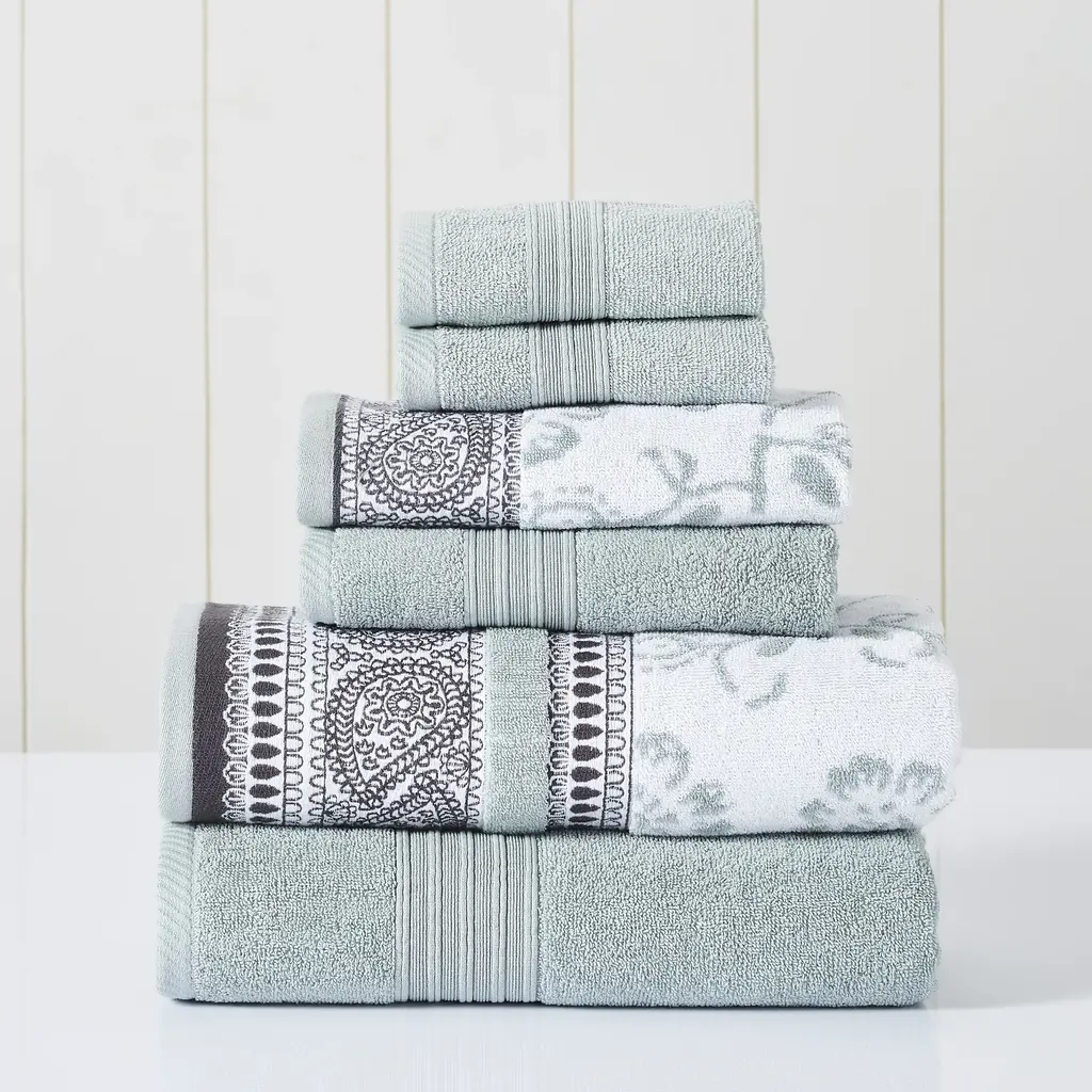 This set is the perfect complement to any bathroom whether you use it to pamper yourself or reserve it for special guests. These towels will feel cozy and comfortable against your skin every time you use them. Half of the set features a solid color design, while the other half is a yarn dyed jacquard pattern that adds texture and beauty to this gorgeous set. Additionally, the towels get softer with washing and drying. Oeko-Tex certified, the definitive mark of excellence for products that are healthy for you and healthy for the environment. Features Materials: 100% Combed Cotton Set Includes: (2) Bath towel, (2) Hand towel, (2) Washcloth Measures: Bath - 27x54 inches, Hand - 16x28 inches, Wash -13x13 inches Oeko-Tex® certified, the definitive mark of excellence for products that are healthy for you and healthy for the environment Features: These 550 GSM towels become softer with every wash. Care Instruction: Machine washable and dryer safe. Recommended - Machine wash gentle cycle with cold water. Sun dry or low tumble dry.