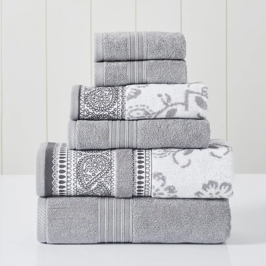 This set is the perfect complement to any bathroom whether you use it to pamper yourself or reserve it for special guests. These towels will feel cozy and comfortable against your skin every time you use them. Half of the set features a solid color design, while the other half is a yarn dyed jacquard pattern that adds texture and beauty to this gorgeous set. Additionally, the towels get softer with washing and drying. Oeko-Tex certified, the definitive mark of excellence for products that are healthy for you and healthy for the environment. Features Materials: 100% Combed Cotton Set Includes: (2) Bath towel, (2) Hand towel, (2) Washcloth Measures: Bath - 27x54 inches, Hand - 16x28 inches, Wash -13x13 inches Oeko-Tex® certified, the definitive mark of excellence for products that are healthy for you and healthy for the environment Features: These 550 GSM towels become softer with every wash. Care Instruction: Machine washable and dryer safe. Recommended - Machine wash gentle cycle with cold water. Sun dry or low tumble dry.