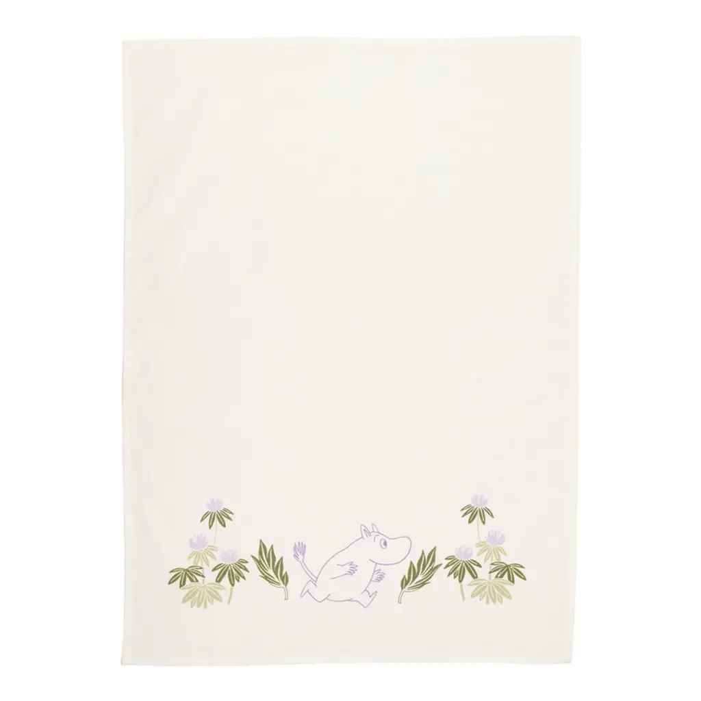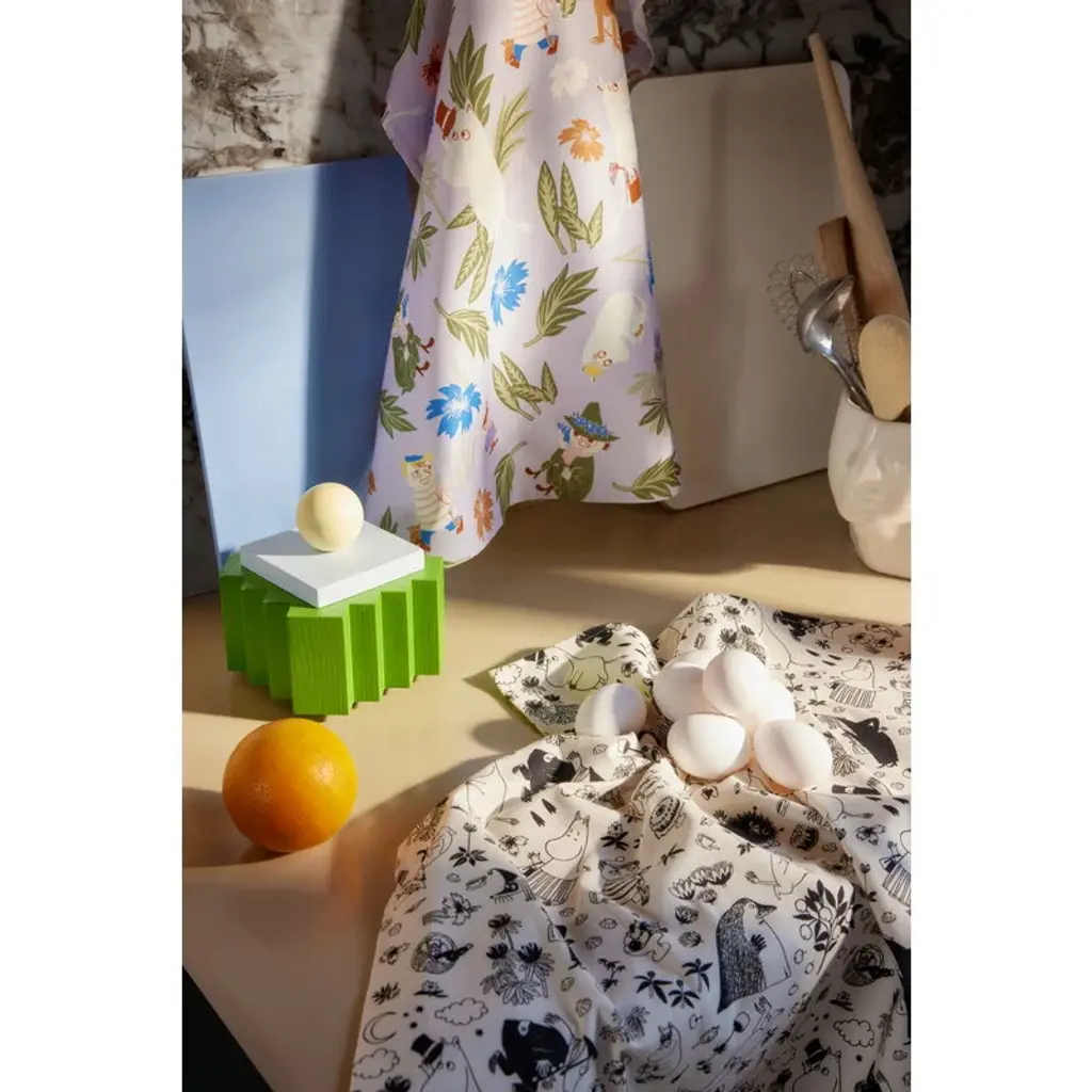 The Moomin kitchen towel set by Moomin Arabia brings the magical atmosphere of Moominvalley to every Moomin fan's kitchen! These lilac and white kitchen towels feature familiar Moomin characters surrounded by blooming summer flowers and lush greenery. The Moomin kitchen towels are made from 100% organic cotton.