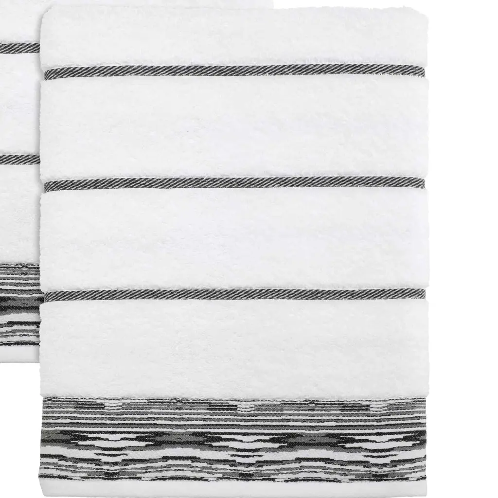 The Nicole Miller Sydney 4-Pc Towel Set is a contemporary design with black lines across the white body and wavy black lines in the border. Heavyweight jacquard woven towels of 92% cotton (body) with 8% polyester (lines). Set includes 1 bath (27"x 54"), 1 hand (16"x 28"), 2 washcloths (13 x 13").