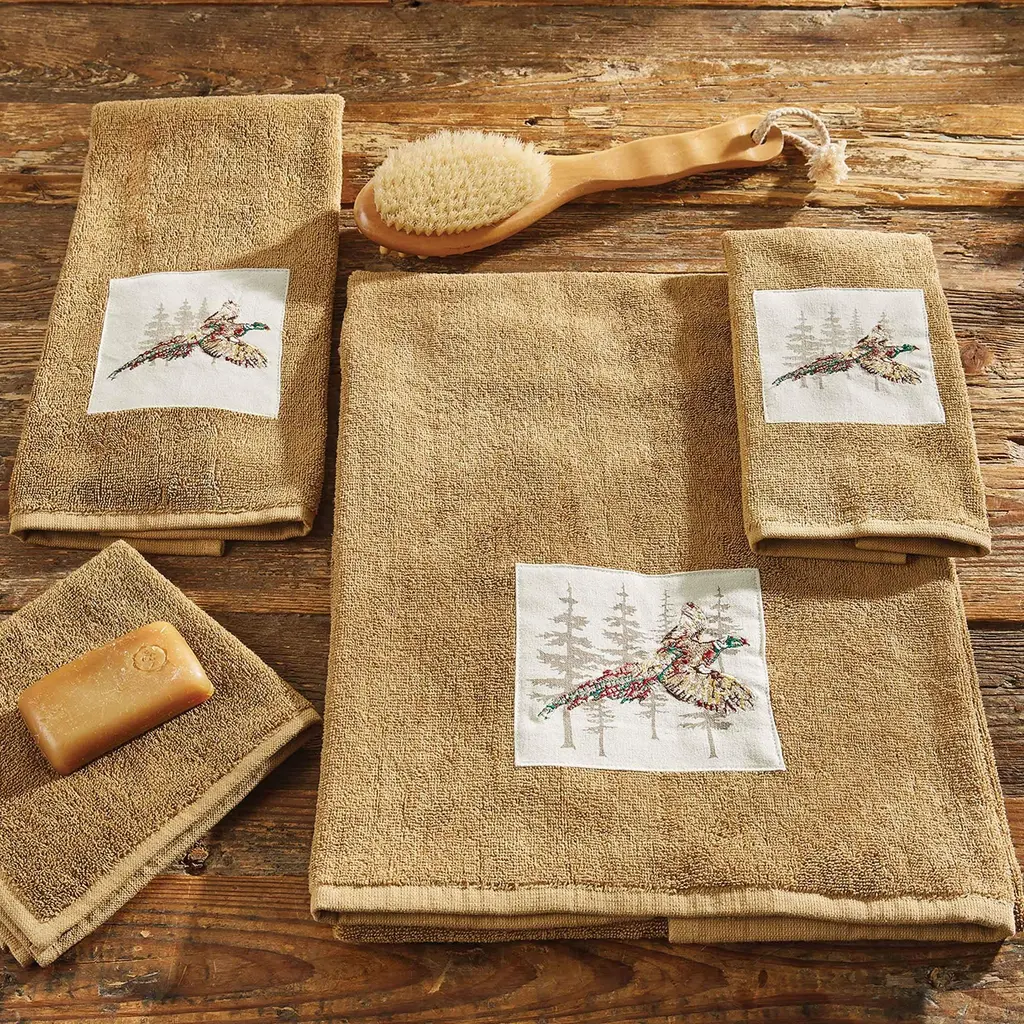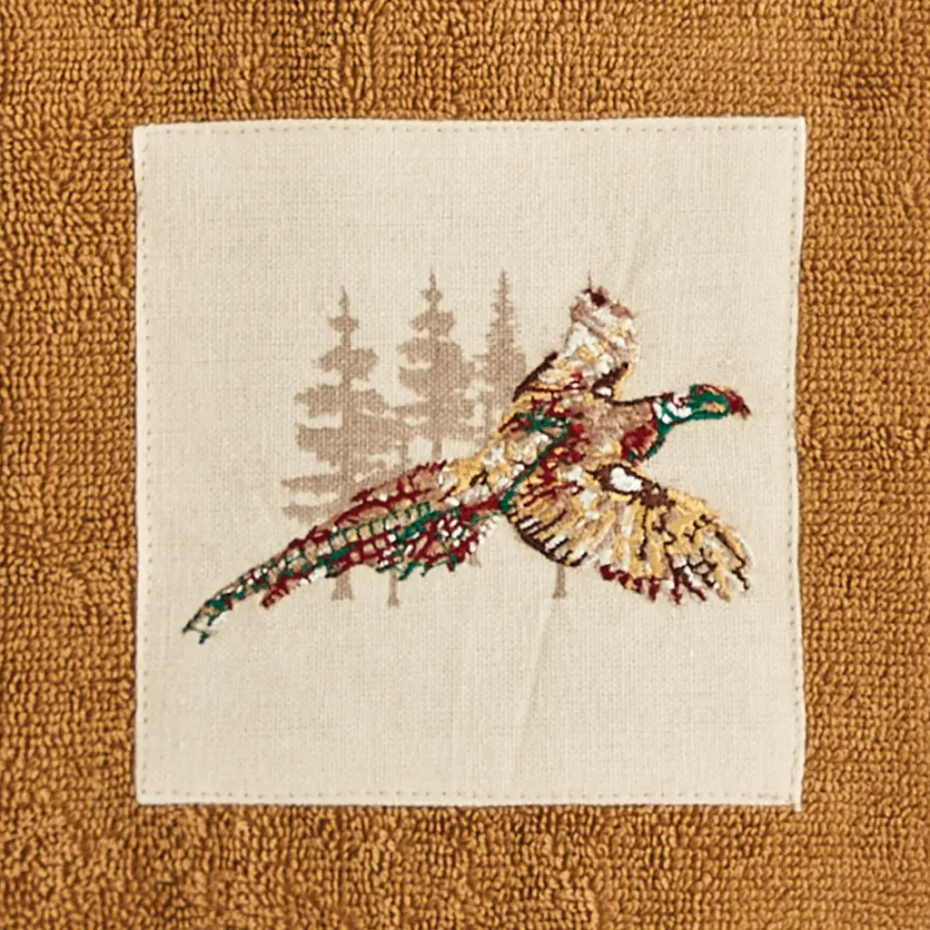 Bring a touch of rustic character to any country bathroom decor with this set of two plush terry hand towels. Stitched with attention to detail, an embroidered bird flies along silhouetted tree lines on a cream patch that is durably stitched against the honey, golden yellow terry material. Whether displayed on a bathroom towel rack or draped along a kitchen sink cabinet, these cotton towels offer the perfect combination of comfort and functionality. Crafted from premium-quality materials, these thick towels are designed to provide superior softness, absorbency, and durability for everyday use when drying your hands off.