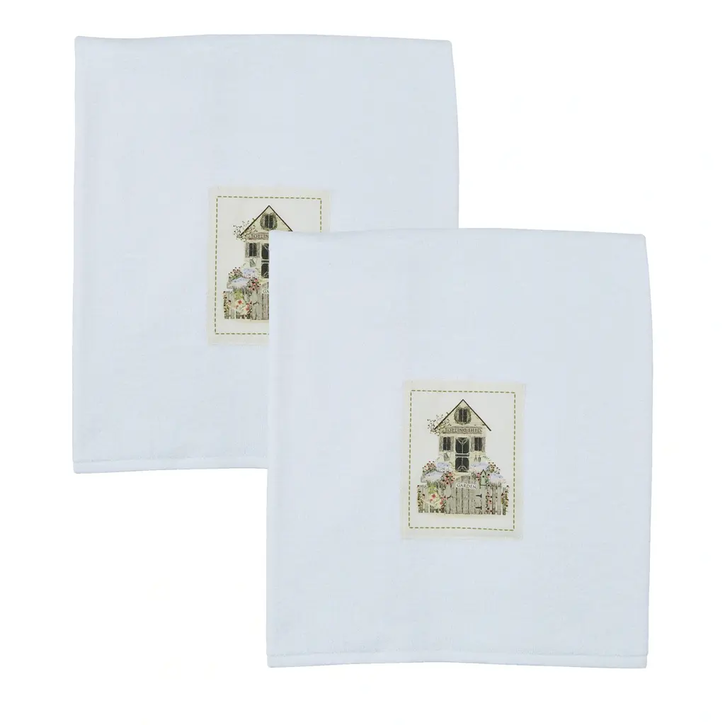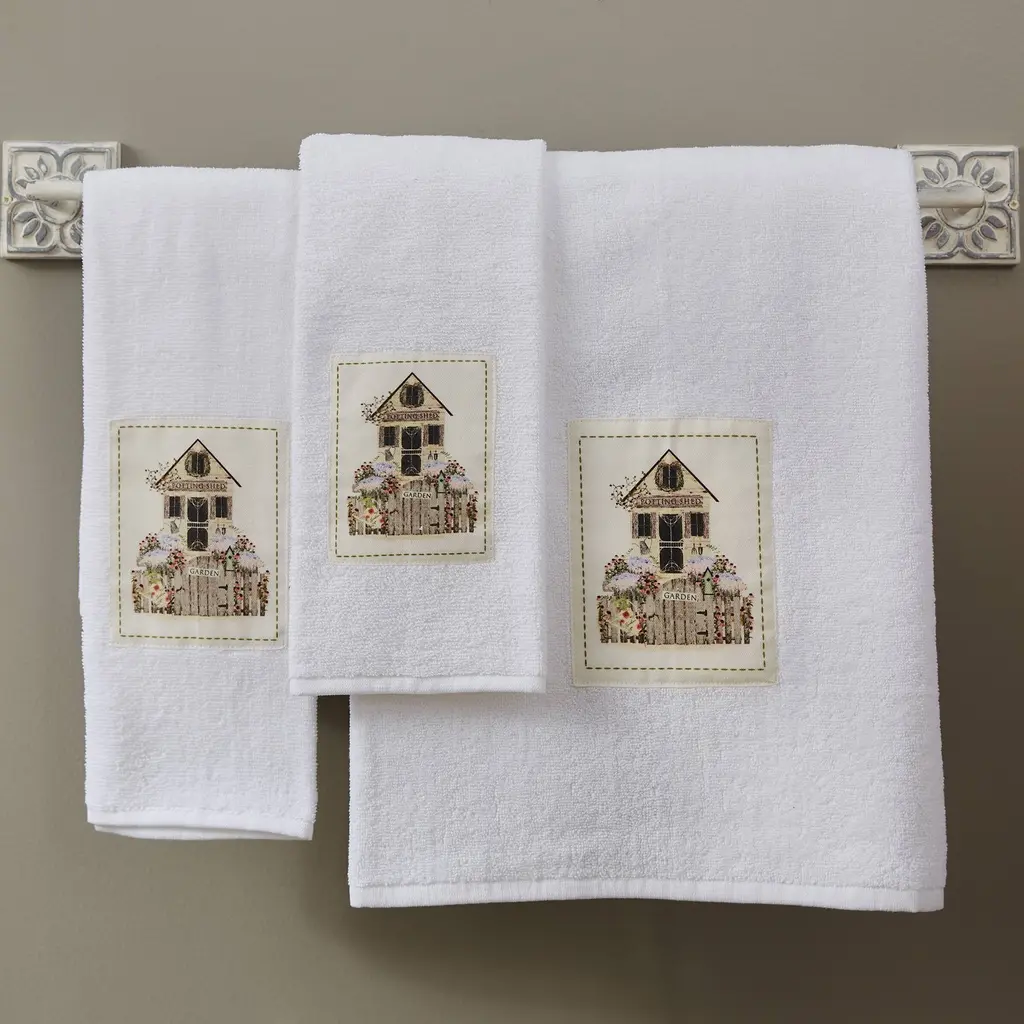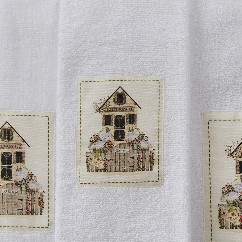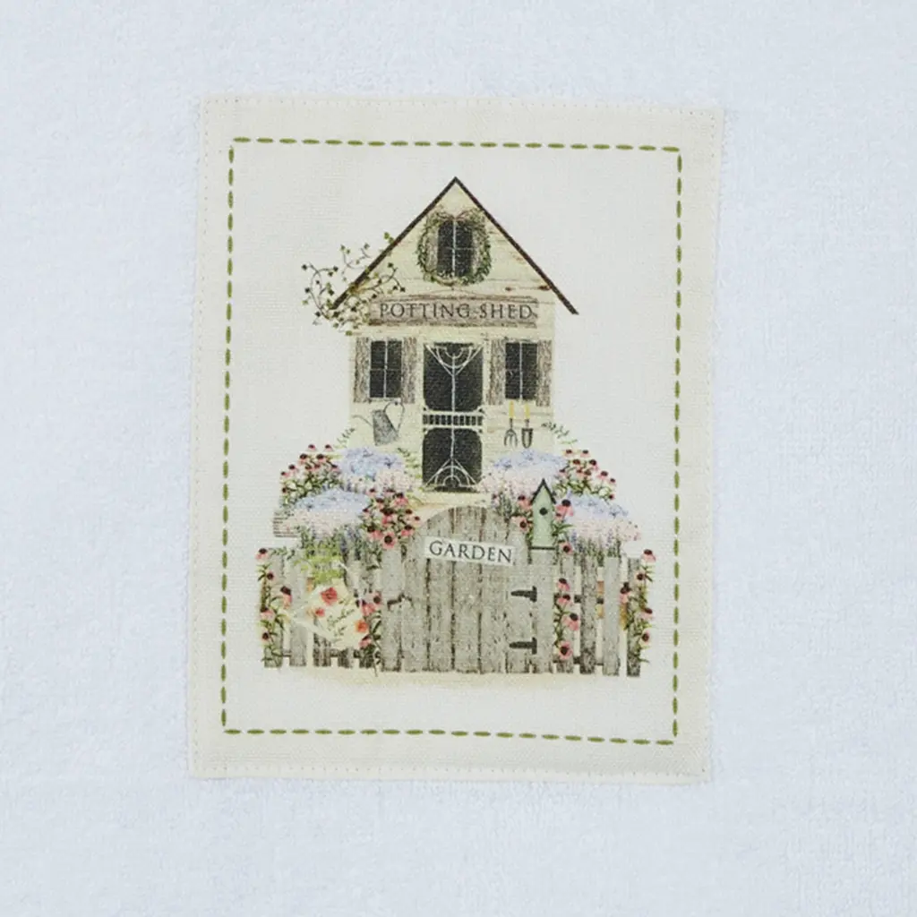 Reflect the spring season's soft shades with antique elements and elegant blooms that bring a sensation of energy and beauty into your farmhouse bathroom decor. Crafted with attention to detail, a garden inspired design featuring a potting shed with various flower details is printed on a cream patch that is durably sewn against the crisp white terry ground. Whether you're stepping out of the shower or lounging by the pool, this set of two plush terry bath towels offer the perfect combination of comfort and functionality. Crafted from premium-quality cotton terry material, these thick bath towels are designed to provide superior softness, absorbency, and durability for everyday use.