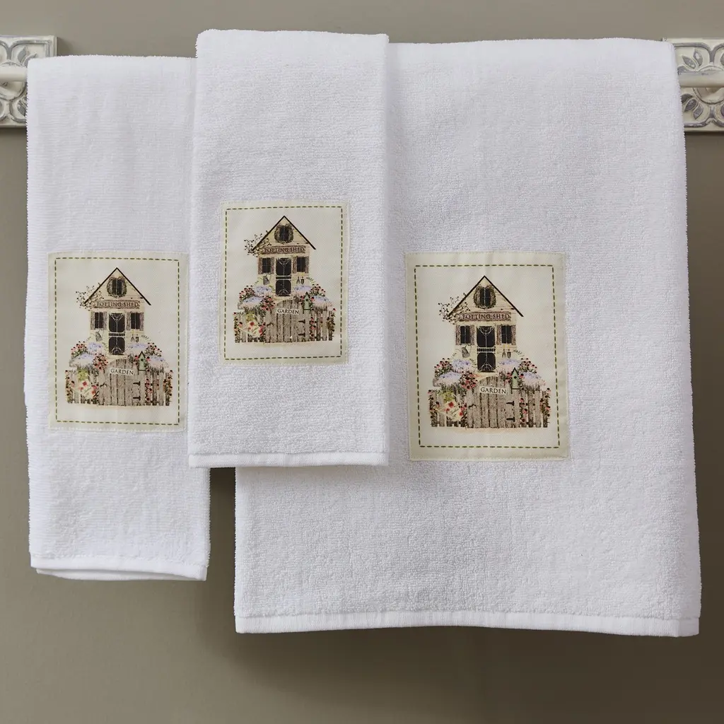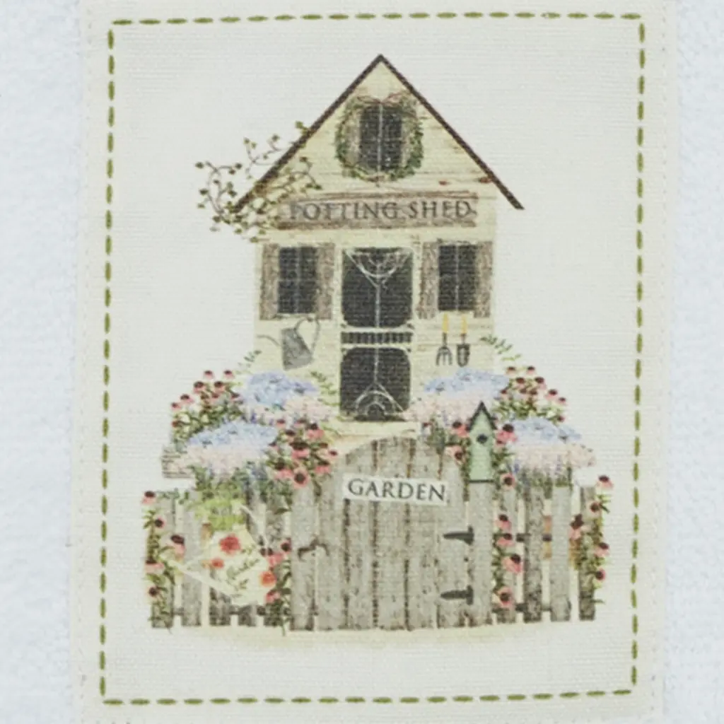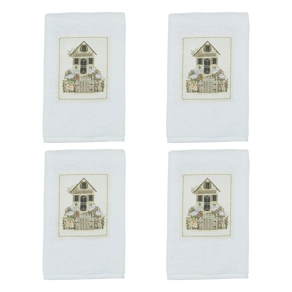 Antique elements and elegant blooms bring a sensation of energy and beauty into spring farmhouse bathroom decor with this set of four terry fingertip towels. Crafted with attention to detail, a garden inspired design featuring a potting shed with various flower details is printed on a cream patch that is durably sewn against the crisp white terry ground. Whether displayed on a bathroom towel rack or draped along a kitchen sink cabinet, these cotton towels offer the perfect combination of comfort and functionality. Crafted from premium-quality materials, these thick towels are designed to provide superior softness, absorbency, and durability for everyday use when drying your hands off.